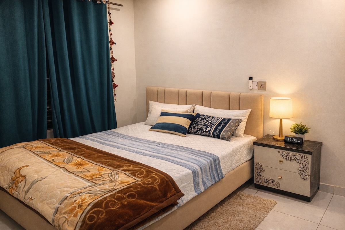 Why choose between convenience, safety, and quality when you can have it all? Welcome to my stylish 2-bedroom retreat a space designed for comfort, ease, and peace of mind. ✔ Prime Location – Steps away from Restaurant, Medical store, Parks, Marts, salons, Bundu Khan bakery, shopping Mall. ✔ Safe & Secure – A well-lit, modern building in a friendly neighborhood. ✔ Thoughtful Comfort– High-end furnishings, premium linens, and everything you need for a seamless stay. PER AC 2K EXTRA