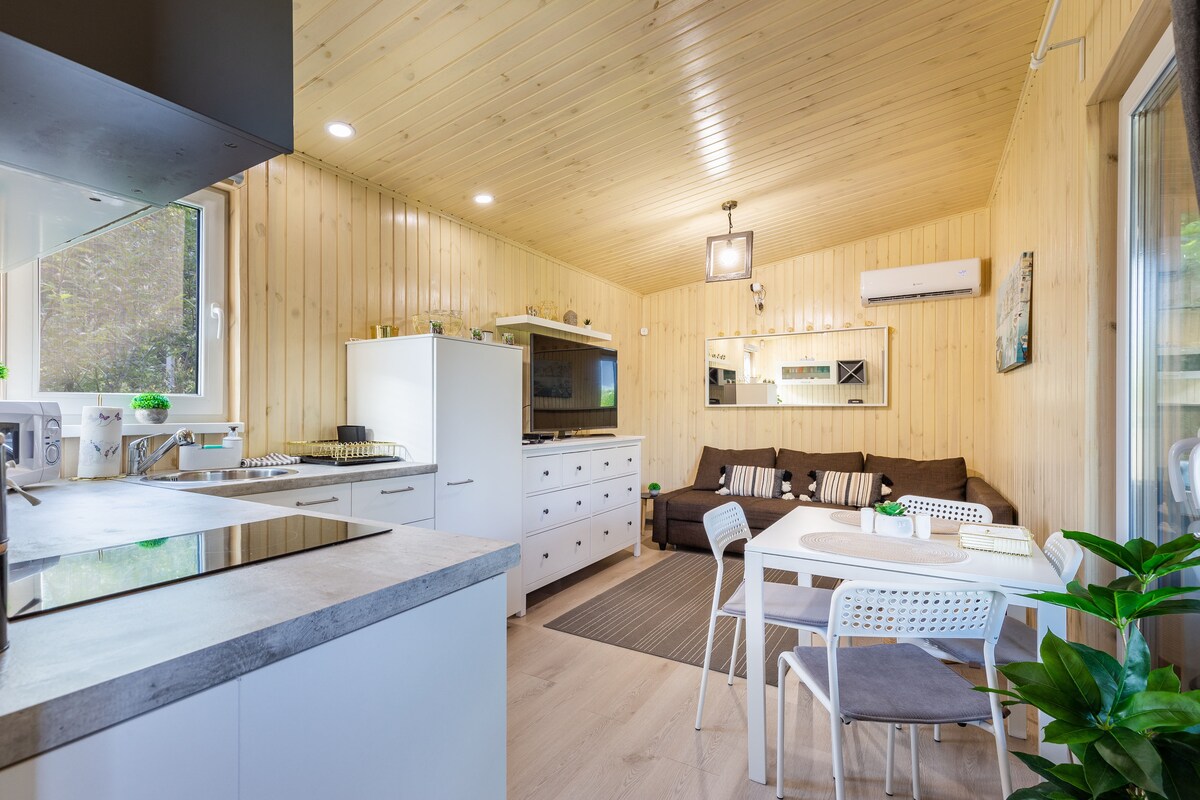 Kuća ima 37 m2: spavaću sobu, dnevnu sobu s kaučem na razvlačenje, kupatilo s tuš kabinom, dobro opremljenu kuhinju. Na terasi se nalazi i masažna kada, dostupna tokom cijele godine. Preporučeno za najviše 4 osobe. Postoji mogućnost dječjeg krevetića, stolice za hranjenje, kolica. Na zahtjev možemo obezbijediti i igračke za različite uzraste (igračke za bebe, zvečarke, graditelji vještina, društvene igre, knjige za bebe, knjige za mlade itd.)