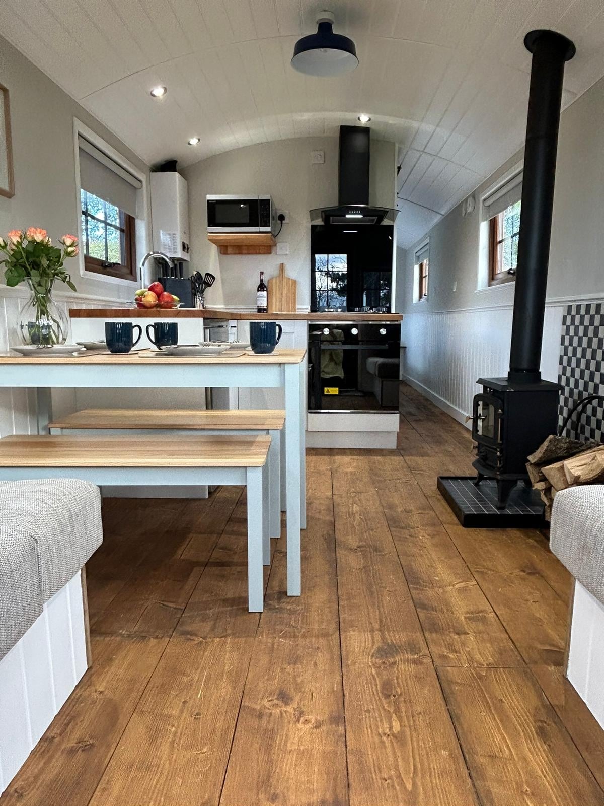 The Fir's Retreat Shepard's hut is the perfect escape for any season. Zvjezdani pogled dok uživate u masažnoj kadi ili se udobno smjestite oko plamenika. Bilo da se radi o romantičnoj pauzi ili porodičnoj avanturi. Ovo prekrasno skrovište nalazi se na privatnom sigurnom terenu kako biste mogli uživati u idiličnom pogledu na zalazak sunca u vrtovima prikladnim za pse.