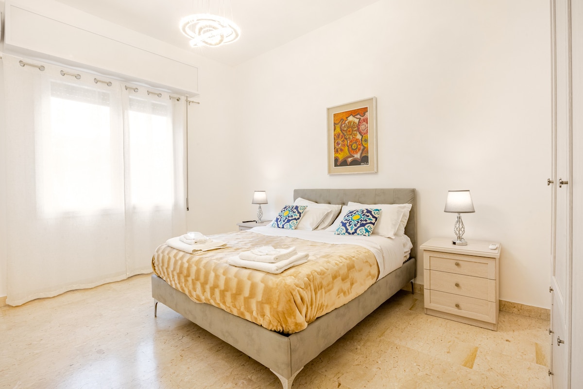 Luxury historic apartment with frescoed master bedroom in Palazzo Natoli (1765), steps from Palermo Cathedral. Two bedrooms (master frescoed, second with en-suite), two bathrooms, spacious living with balcony on Corso Vittorio Emanuele. AC, Wi-Fi, 55” TV, soundproof windows. Welcome breakfast basket included. Perfect for couples, families, and city breaks.