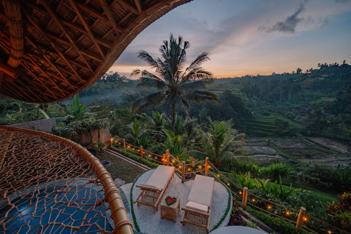 Doživite Bali iz pogleda na ptice u vili Avana Treehouse Bamboo. Ovaj jedinstveni doživljaj s bambusovom vilom nalazi se na 15 metara visine među drvećem koje se prostire na rubu litice. Uživanje u pogledu iz bilo kojeg od 3 sprata će vas ostaviti opušteni i uz osjećaj da plutate u zraku. Ispod plutajuće kućice na drvetu nalaze se prostrana, bujna rižina polja duž rijeke Ayung koja se sastaju s planinama. Na lijevoj strani možete vidjeti vulkan Agung, a na desnoj Indijski okean.