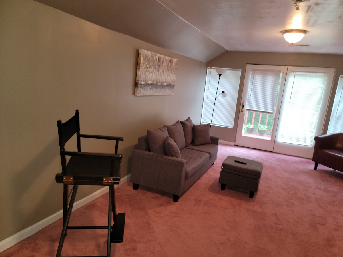 Privatni stan u donjem dijelu naše kuće. Kuća u ruralnom okruženju - možete vidjeti jelene bijelog repa ili druge divlje životinje. Uživajte u mirnom okruženju. Do Rte 70 i trgovačkih centara udaljeni smo 5 minuta automobilom. Naš smještaj nije siguran za djecu. Oprema za vježbanje je dostupna za korištenje na vlastitu odgovornost. Mi kontrolišemo HVAC i prilagođavamo se zahtjevima. Možda nije prikladno za osobe s poteškoćama u kretanju zbog šetnje do ulaza. Zabranjeno pušenje. Nismo opremljeni za kuhanje. Nema šporeta.