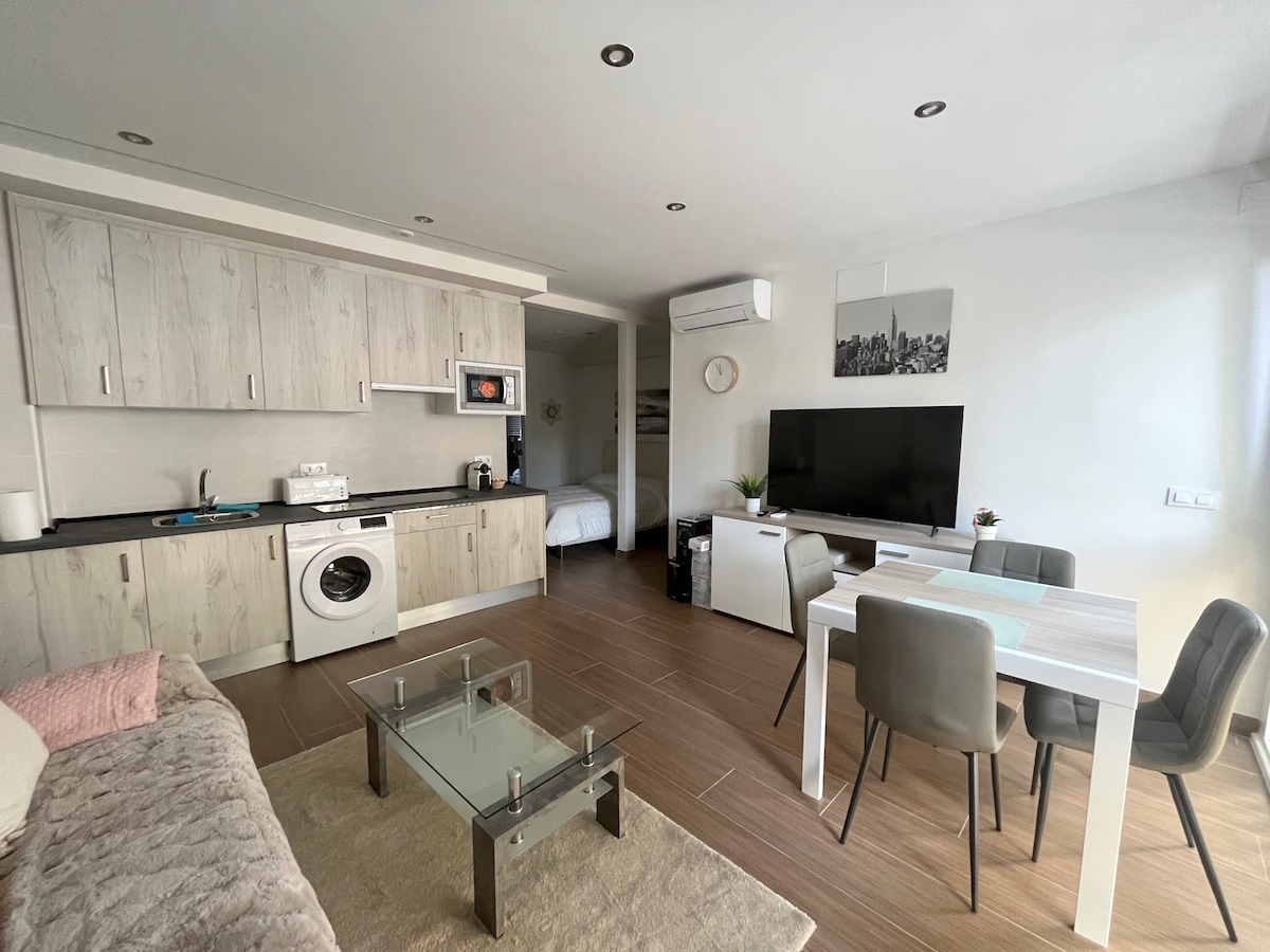 Udoban i avangardni novouređeni studio. Moderan dizajn u mirnom okruženju. Sve što vam je potrebno u okruženju, supermarketi, autobuska linija i obližnji metro. * Veliki krevet 150 x 190 * Visokokvalitetna pumpa za grijanje i hlađenje * Kupatilo s WC-om i pločom za tuširanje * WI-FI, televizija * Novouređeni, moderni zrak * Dostupna je opcija parkiranja (potrebno je zatražiti)