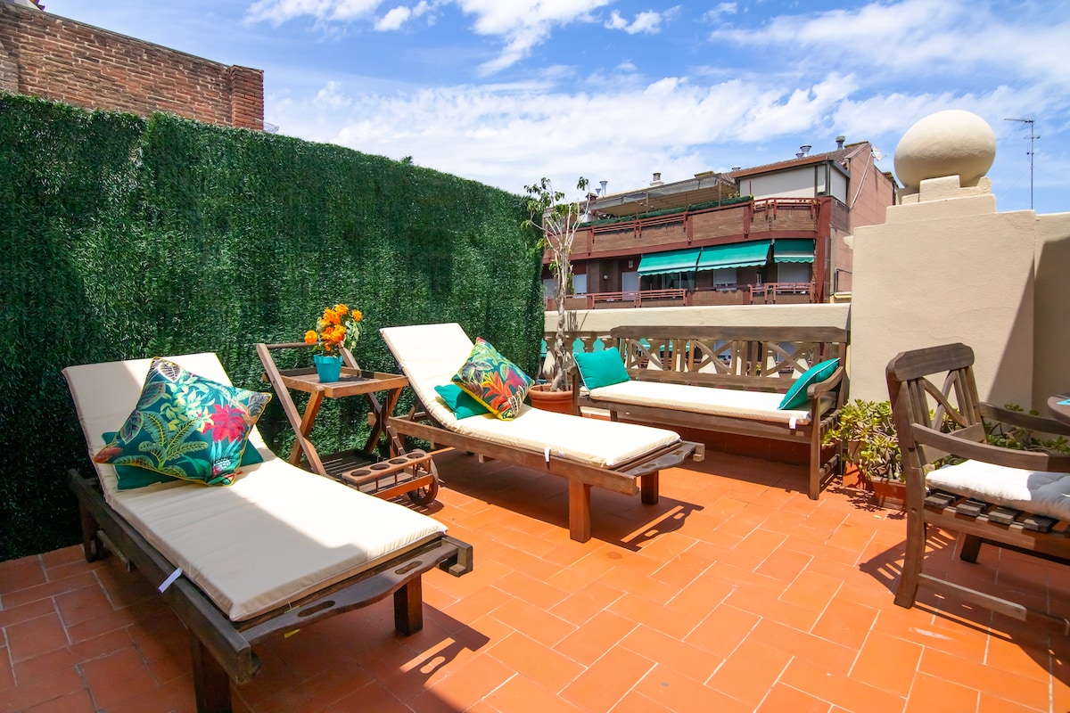 This gorgeous 90m2, bohemian duplex ONE BED apartment has amazing views over the entire city from the large plant -covered terrace. Walking distance from Las Ramblas. There is a bedroom with Queen sized bed downstairs beside a long balcony and another open-plan living area upstairs beside the terrace. There's a smart Tv, free wifi and washing machine and dryer. (please note: it's on the 6th floor and there's NO elevator).Tourist tax (€6.25 per person/per night) IS INCLUDED in the nightly price.
