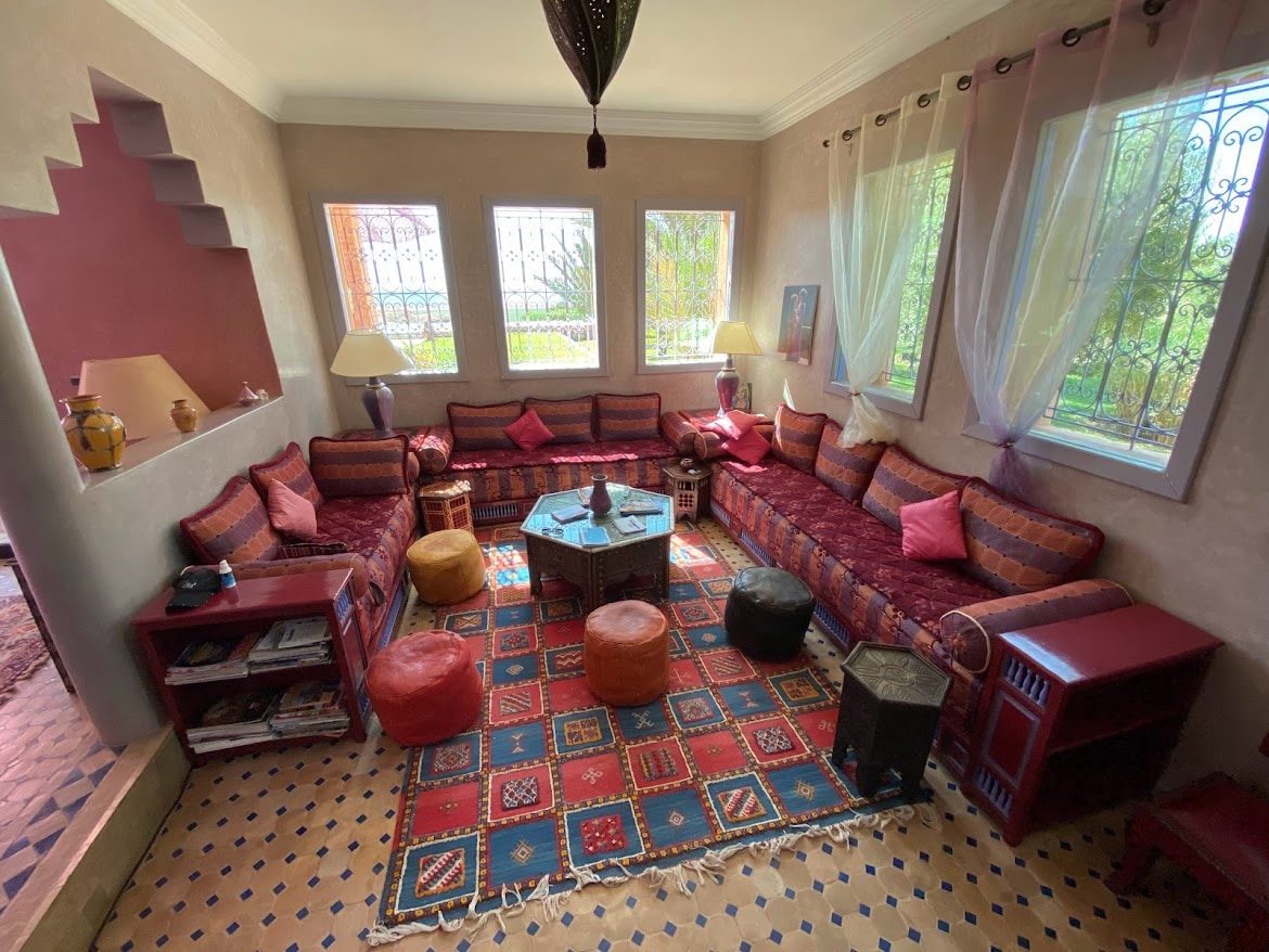 490 dirhama po noćenju po osobi minimalan broj osoba: 2 kapacitet 6 Doručak je uključen Vila 400m², bazen, saloni s kaminom, 3 spavaće sobe 3 tuš kabine, kuhinja. Centar grada je udaljen 5 minuta Wi-Fi internet TV Oduševit ćete ovaj jedinstveni i romantični odmor u profinjenom berberskom okruženju; Mnogi mali saloni vam omogućavaju da se opustite, a bazen da se rashladite; Mir i tišina u centru grada Azizino diskretno prisustvo čini vaš boravak rijetkim i jedinstvenim smještajem