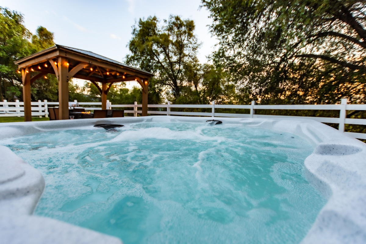 Dobro došli u svoj savršeni odmor; smješten na mirnom vrhu brda s pogledom na dolinu, ovo prostrano utočište s 4 spavaće sobe udobno prima 12 osoba. Bilo da se opustite u privatnoj masažnoj kadi pod zvijezdama, opustite se u sauni od cedrovine s punom staklenom prednjom stranom okrenutom prema dolini ili radite na daljinu u privatnoj kancelariji s brzim Starlink internetom, ovaj smještaj ima sve. Također dočekujemo vašu krznenu porodicu, s ograđenim parkom za pse u sklopu objekta za osvježenje na otvorenom. Rezervišite nezaboravan boravak!