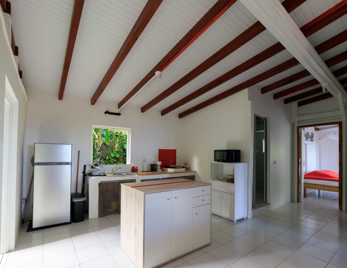 Studio cosy de 15m² en rez-de-jardin, niché entre mer et montagne dans un jardin tropical de 1400 m² avec bassin, piscine réservée exclusivement aux voyageurs du studio, salon extérieur et espace barbecue. Idéal pour se détendre après une journée de découverte. À 1h de l’aéroport, 20 min de l’embarcadère pour Les Saintes, 15 min de la Soufrière, à proximité des cascades, rivières, sentiers de randonnées et commodités. Un cadre parfait pour se ressourcer et profiter de la nature.