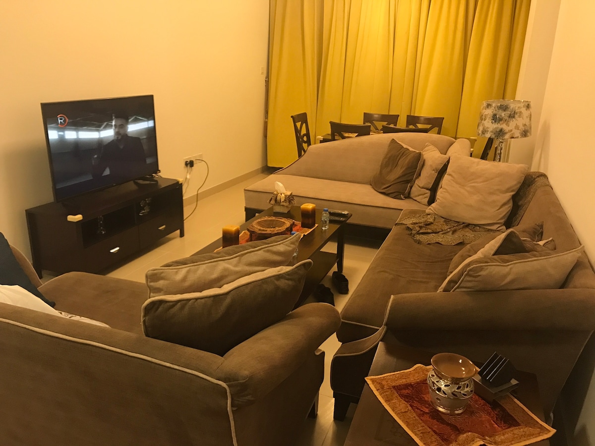 Uživajte u udobnom i elegantnom boravku u ovom dobro pozicioniranom dvosobnom stanu u južnom Ghubrah, idealnom za parove, porodice ili poslovne putnike. Osmišljeno za najviše 4 gosta. U čemu ćete uživati • Dvije udobne spavaće sobe s kvalitetnom posteljinom • Svijetli dnevni boravak sa Smart TV-om • Potpuno opremljena kuhinja • Brzi Wi-Fi • Besplatan parking Blizu trgovina, restorana i glavnih atrakcija Muskata. Prijevoz do aerodroma, čišćenje i opskrba namirnicama dostupni su na zahtjev.