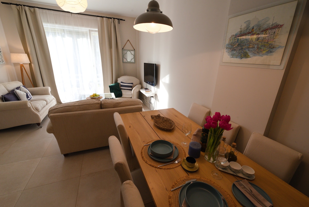 Osjećajte se kao kod kuće u našem udobnom, modernom stanu i opustite se s cijelom porodicom u ovom mirnom smještaju. Stan se sastoji od svijetle spavaće sobe s udobnim bračnim krevetom, dvokrevetne sobe, moderne potpuno opremljene kuhinje i dnevne sobe osvijetljene suncem s Wi-Fi mrežom i IP TV-om. Ima prostrani balkon s roštiljem u kojem možete uživati u kasnim večernjim satima. Nalazi se usred borova i okružen je zelenilom. Nalazi se 150 metara od mora. Zalazak sunca, priroda i more - sve na jednom mjestu!