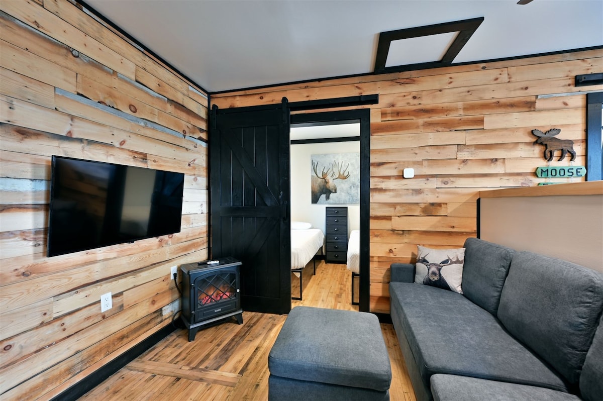 Escape to our rustic Lumberjack cottage, a cozy 2-bed, 1-bath retreat for 5. Modern comforts like A/C, Wi-Fi, and a full kitchen meet charming wood-paneled interiors. Located one block from Drummond Lake and with access to Trail 63, it's an adventurer's paradise. Enjoy a private yard with a fire pit and bring your pet along! Perfect for couples or a small group seeking a comfortable base for outdoor exploration. Walk into the cottage, and the first word that comes to mind is "cozy".