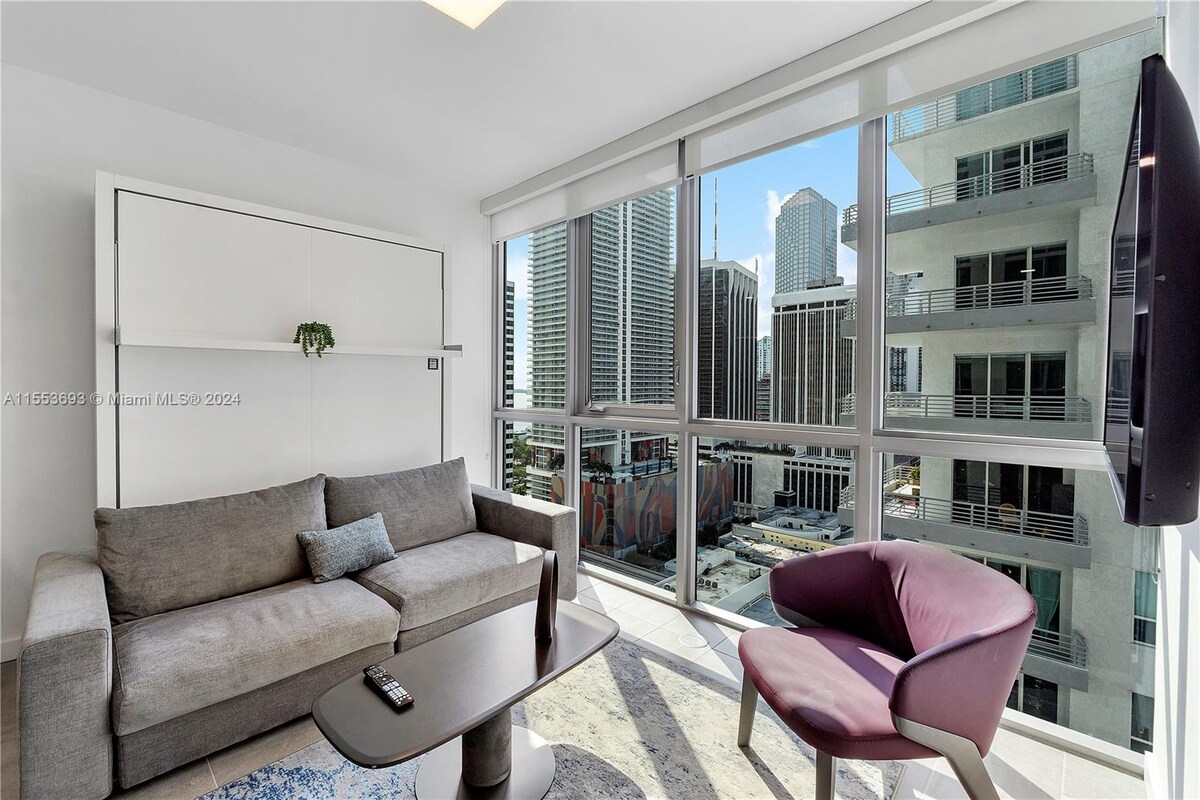 ★Uživajte u elegantnom doživljaju u ovom smještaju koji se nalazi u centru grada★ Odsjednite u našem udobnom i luksuznom mirnom, visokom spratu, potpuno opremljenom bračnim krevetom, mramornim kupatilom s tušem i kadom, pristup svemu u srcu prestižnog područja Brickell u Miamiju. Vrhunski sadržaji s 5 zvjezdica, teretana 24 sata, grijani bazen i masažna kada s masažnom kadom s bazenom, teniski tereni, spa centar, restorani, posluga u sobu. Brickell je najbolja destinacija u Miamiju s restoranima, prodavnicama i noćnim životom koje nudi Miami!