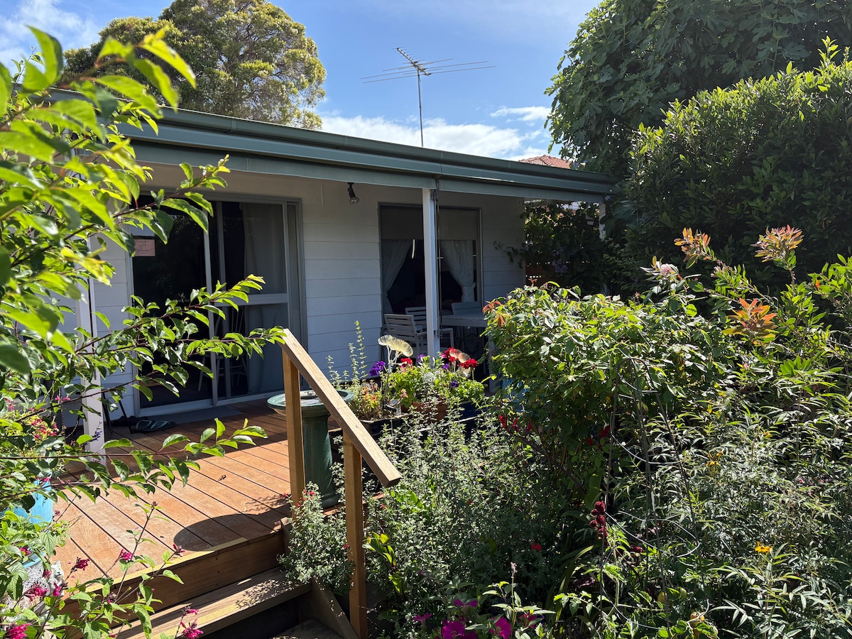 The cottage is self contained and is a well designed space that accommodates a queen sized bed, bathroom and a separate study and is set in an enchanting cottage garden. The well equipped kitchen is in a separate space though part of the cottage and is accessed by its own door from the decking, so you don't have far to go. In the morning lorikeets and other wild birds come to feed and you will be awoken to the romantic sound of birdsong. During spring and summer the garden is at its loveliest.