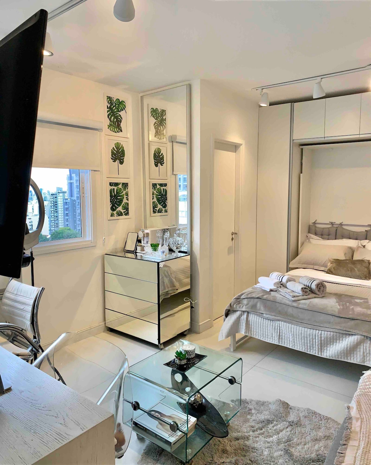 Boutique studio s jednim od najljepših pogleda na grad São Paulo. Nalazi se 2 minute hoda od podzemne željeznice. Potpuno opremljena kuhinja s frižiderom skrivenim drvenim vratima. Wi-Fi, klima uređaj i pametni TV od 55 inča. Samostalni dolazak s pametnom elektronskom bravom. Igrajte tenis ili idite u teretanu i opustite se u bazenima (na otvorenom ili u zatvorenom prostoru) i saunama (mokrim ili suhim) nakon toga. Zajednički prostor također uključuje zajedničke radne prostore i vešeraj. Posjetioci moraju biti prethodno registrovani na prednjem odredištu.