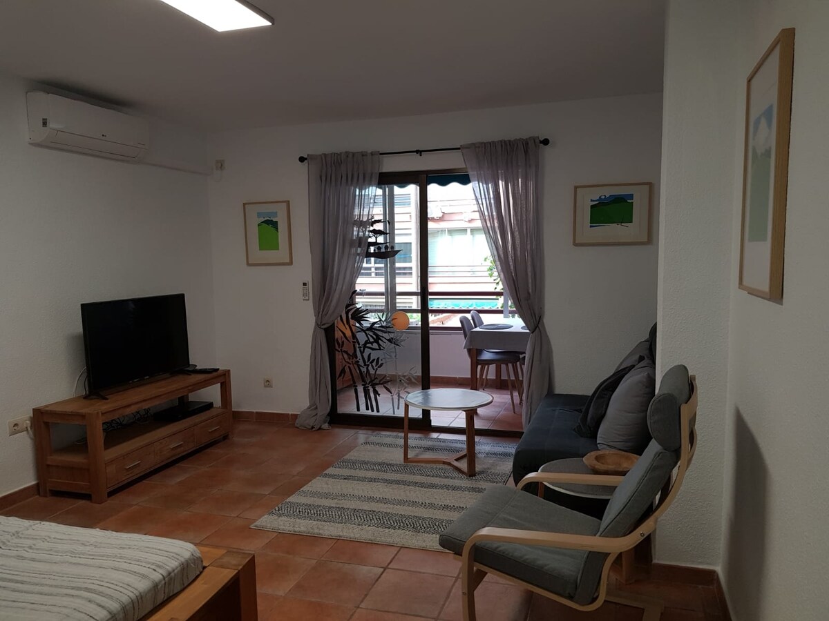 Es un estudio muy sencillo y pequeño en el centro de San Juan pueblo, equipado suficientemente para cubrir las necesidades básicas. Por su tamaño es ideal para una o dos personas, pero tiene un sofá cama y pueden quedarse una o dos más. Tiene sábanas, toallas, menaje de cocina, plancha, televisión, wifi etc. Cerca de todos los servicios como supermercados, tiendas, cafeterías, bancos, transporte. Está a 2 kilómetros de la playa de San Juan y del campo de golf y a 6 del centro de Alicante.
