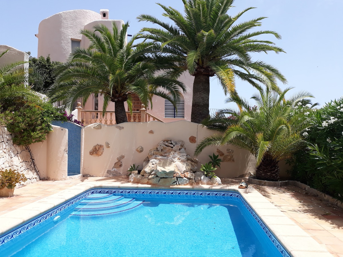 "Villa Sunset Moraira" - Enjoy dreamy days in a modernized Spanish-style villa for up to 8 guests. Highlights: - private pool (with heating) - large outdoor area with south-facing views - Outdoor kitchen with barbecue - air conditioning, fans and heating in all rooms - high-quality furnishings - 3 bedrooms with box-spring beds - 2 modern bathrooms with shower and bathtub - fully equipped kitchen - fast Wi-Fi - Smart TV - quiet location, close to the beach ☆ "Clio's villa is an absolute Jewel!"