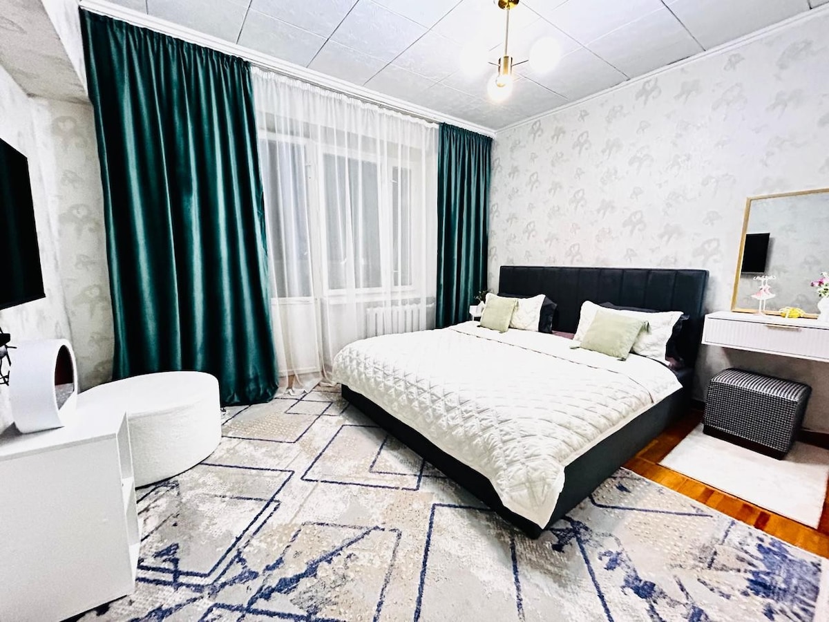 Ovaj studio apartman površine 50 m² nalazi se u srcu grada. Smješten u klasičnoj zgradi iz sovjetskog doba iz 1971. godine, nudi zadivljujući pogled na gradsku panoramu, planine, TV toranj, Kok Tobe i legendarni hotel Kazahstan. Ova četvrt je sigurna i živahna, što je čini idealnom za kratke izlete ili produžene boravke. Stan je potpuno opremljen svim osnovnim sadržajima kako bi se osiguralo udobno i praktično iskustvo.