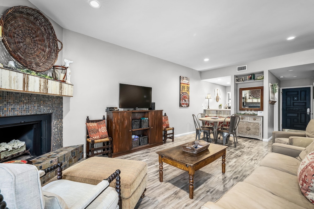 Pobjegnite u moj apartman Riverwalk! Ova jedinica ima prekrasan pogled na sudnicu okruga Bexar iz 1897. godine i katedralu San Fernando iz 1755. godine! Prostor je osmišljen tako da odražava kulturu i zabavu TX/SA! Restorani i kupovina su udaljeni samo nekoliko koraka! Prošetajte ili iznajmite bicikle/skutere kako biste istražili toranj, muzeje, misije, Alamo ili se zaputite riječnim brodom do The Pearla! Uživajte u znamenitostima ili ostanite na pikniku na balkonu na 2. spratu dok riječni brodovi prolaze ispod!