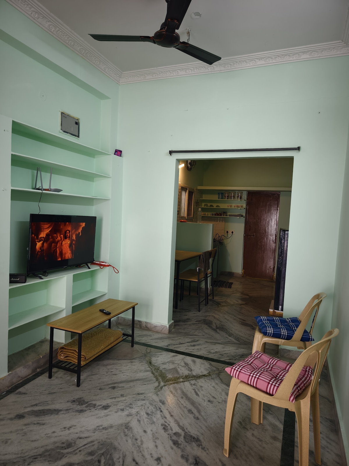 Situated in a calm residential area, this listing is perfect for couples . The house features two rooms, air conditioner in one. A living room with an installed projector and sound bar for state of the art entertainment, OTT available. Utensils are available and kitchen can be used for minor cooking, as long as the guest cleans up after themselves including the dishes and stove. We request that guests mention the correct number of people that are coming and also provide identity proof.