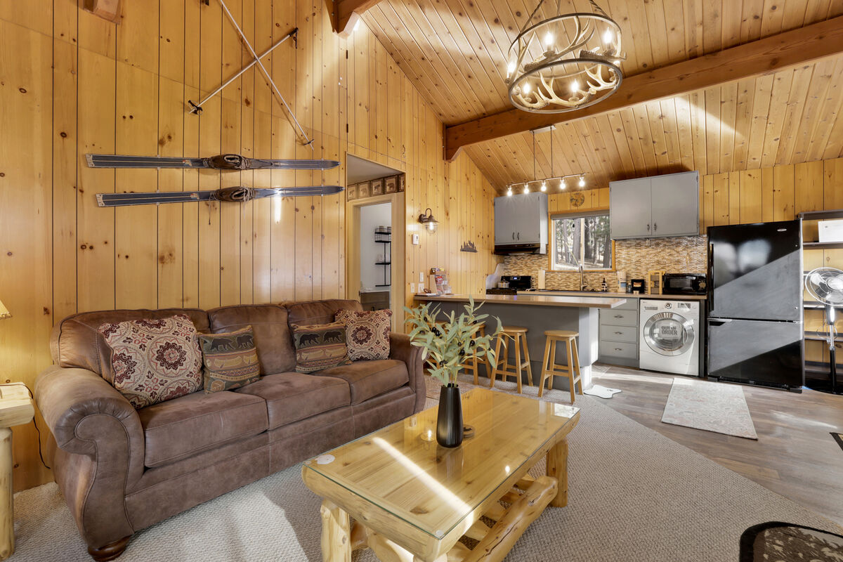 This modern cabin is perfect year-round and walkable to the lake, Alpine Sled Park, and Big Bear Brewery. Just a mile from the Village and minutes to the slopes! Features an open-concept layout with a large kitchen island, a custom game room with arcade games and many more/ The backyard features a hot tub, firepit, and grill—perfect for relaxing after a day of fun. Public lake access is about half a mile from the cabin.