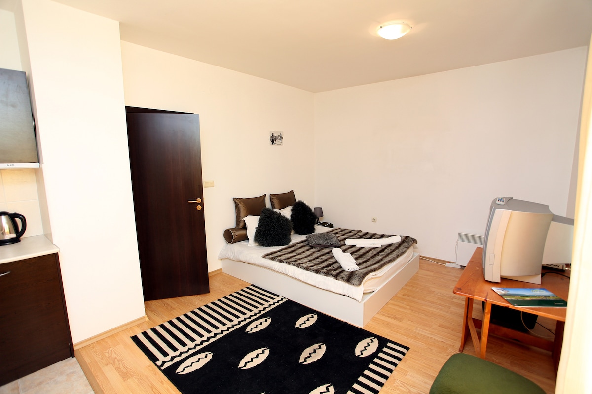 Dvosobni stan s dva balkona, u centralnoj zgradi 4** * Belvedere Holidey Klub. Hotel se nalazi 550 m od žičare s prekrasnim pogledom na planine Perin. Stan ima 2 TV-a, Wi-Fi, mikrovalnu pećnicu, toster, ploču za kuhanje, kuhalo za vodu i sve što vam je potrebno,sigurno. Hotel ima vanjski i zatvoreni bazen,saune,sportsku dvoranu i druge usluge (plaćanje nije obavezno). Prikladno za do 4 osobe. Naknada za čišćenje 70 lev ili 35 €. Nema kućnih ljubimaca. Pušenje nije dozvoljeno.