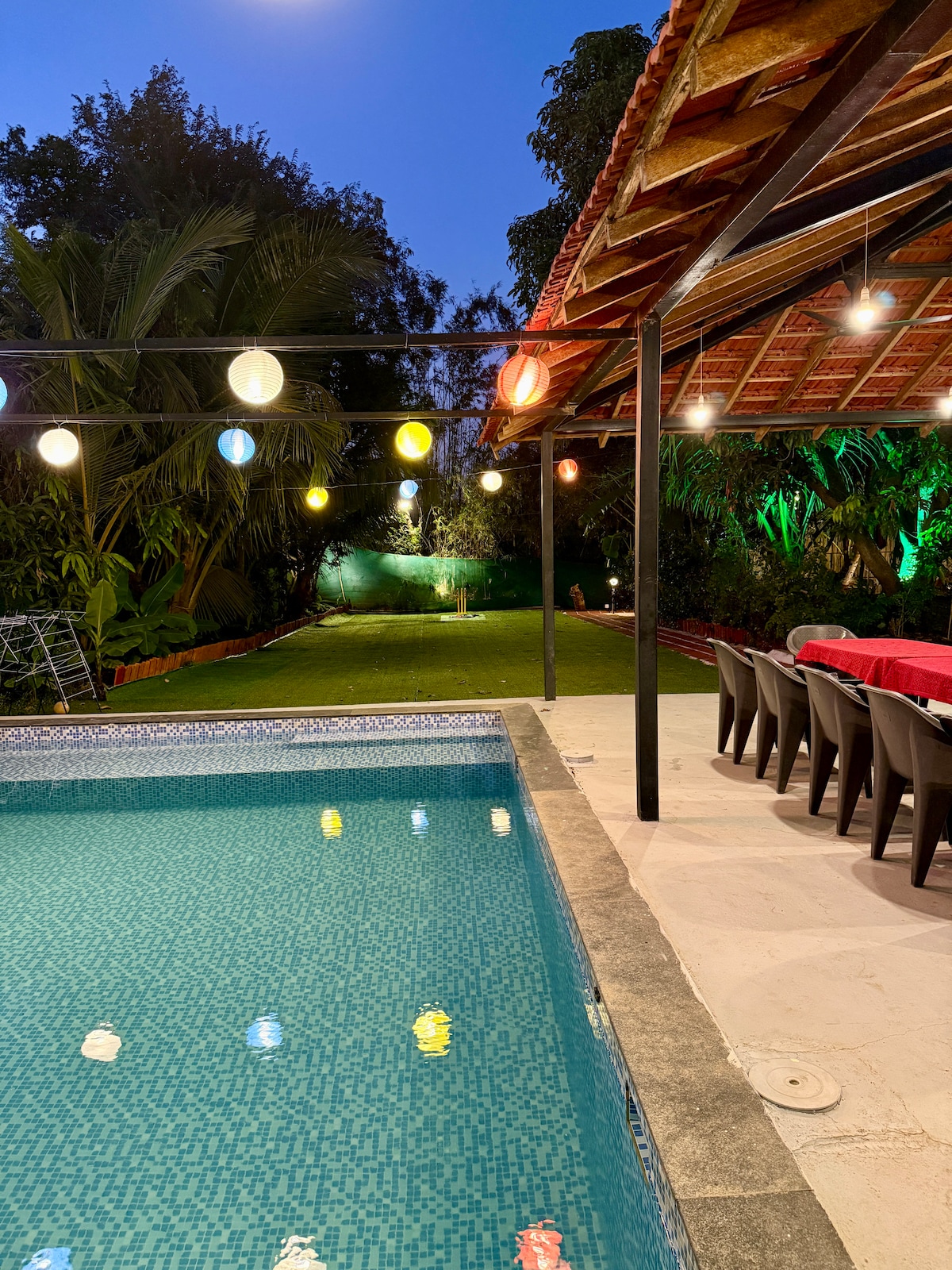 „Savršeno za porodice, grupe i prijatelje koji traže privatnu vilu s pogodnostima u stilu odmarališta, samo 10 minuta vožnje od pristaništa Mandwa.” Privatni bazen, kućni kuhar ili autentična maharaštrijska vegetarijanska i nevegetarijanska hrana, uslužno osoblje s 5 zvjezdica, podrška 0–24. 4 spavaće sobe, 4 kupatila, dnevni boravak, kuhinja, vrt i vanjska sjenica. Lokalne atrakcije su plaža Saswane, sportovi na plaži Awas, pristanište Mandwa, muzej Karmarkar i obližnji kafići.