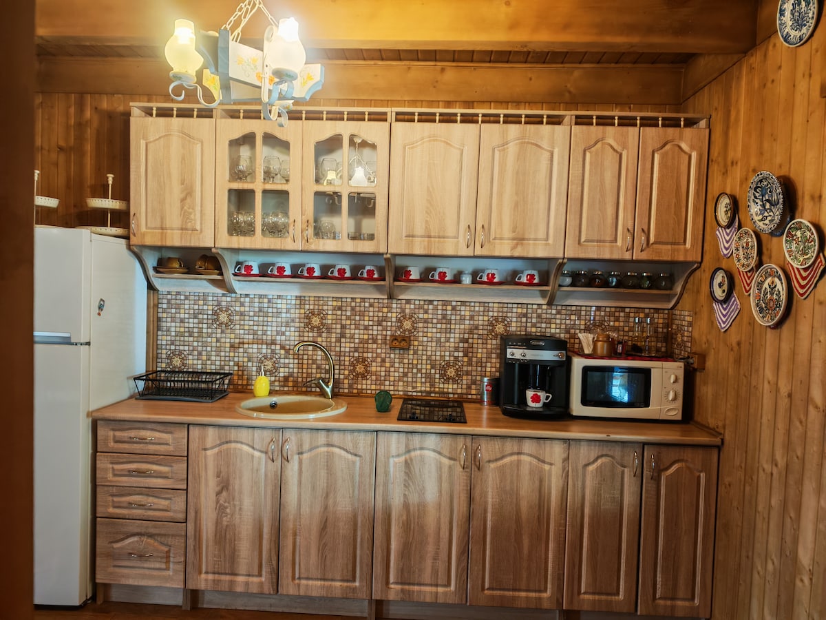 Zapanjujuća kuća na brdu Prekrasna tradicionalna transilvanijska drvena kuća potpuno renovirana modernim detaljima! Smještena na brežuljku, 300m od autoputa E60, ova drvena kuća iz 1810. godine potpuno je renovirana 2016. godine od strane nas. Uključili smo sve moderne konforte: podno grijanje, klima-uređaj, vrhunsko kupatilo i krevete. Kuhinja je na minimalnom nivou opremljena umivaonikom, malim hladnjakom i aparatom za kafu.