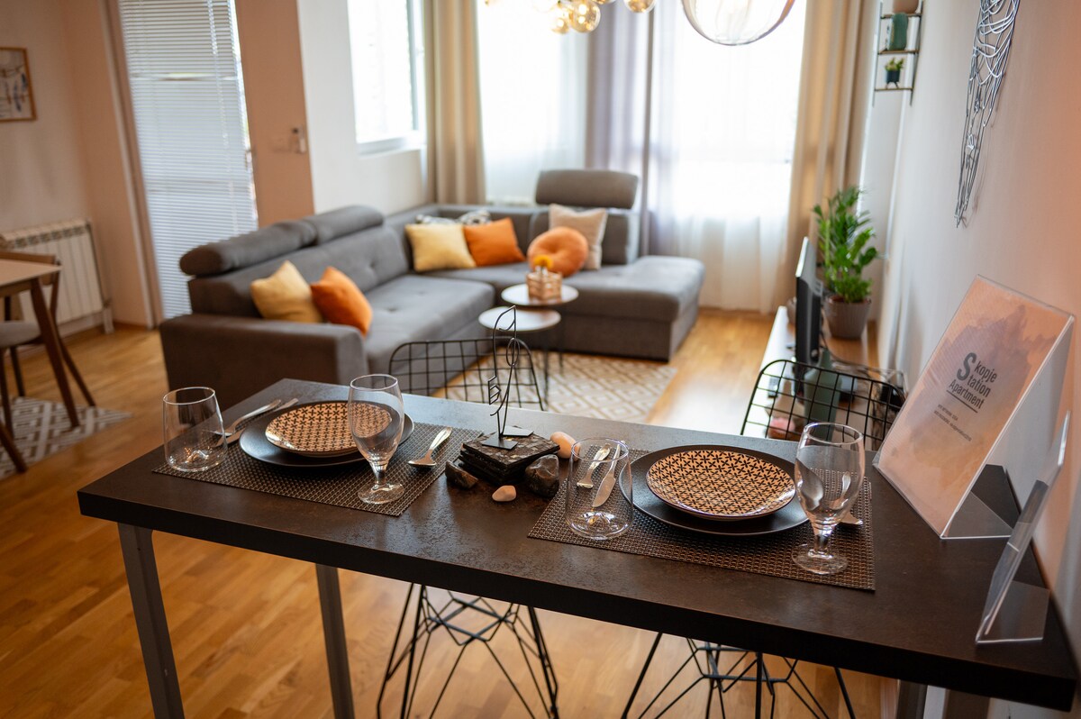 Uživajte u elegantnom doživljaju u ovom smještaju koji se nalazi u centru grada Ovo je POTPUNO NOVI stan od 60 m2 5 minuta hoda od gradskog parka (stadion) i od glavnog trga. Najbolja moguća lokacija, vrlo blizu lijepih ulica Debar Maala s mnogim barovima i restoranima. Stan ima 1 spavaću sobu s bračnim krevetom i dnevnom sobom s udobnim kaučem na razvlačenje + krevetom na razvlačenje Također 2 balkona iz obje sobe, jedan s pogledom na planinu Vodno. Možete ga koristiti za ispijanje kafe ili ručak