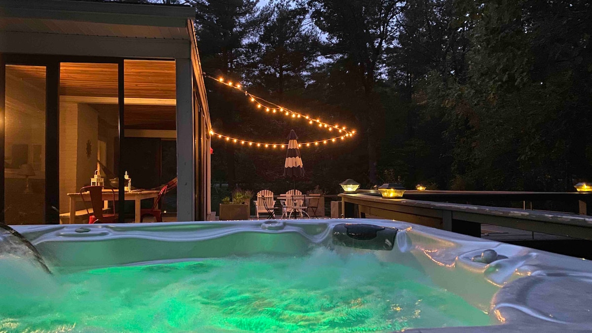 Smještena u mirnoj šumi Saugerties u New Yorku, ova luksuzna brvnara s kosim krovom nudi modernu udobnost i prirodne ljepote. Samo 10 minuta od Woodstocka i 2 sata od New Yorka, NJ. nalazi se na privatnoj parceli od 2 hektara. Jednostavan pristup. Sadrži vrhunske madrace Casper veličine bračnog kreveta, aparat za espresso Breville, 4K projektor, ognjište, roštilj, hidromasažnu kadu na drva od cedra i saunu. Prikladno za pse! Udobno i elegantno utočište u blizini mjesta za planinarenje, skijanje i vrhunske restorane u Catskillsu. Posjetite naš ig ‘highwoodsaframe' za više informacija!