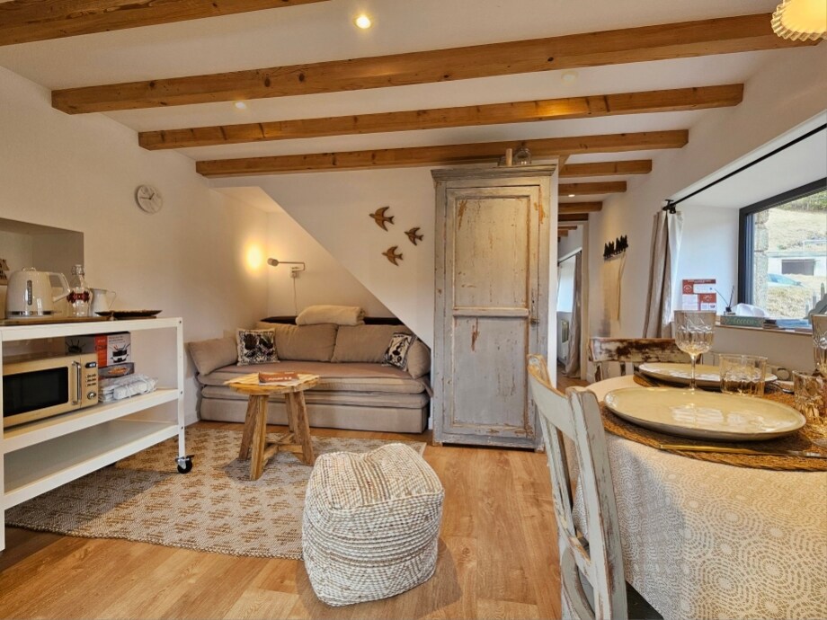 Studio dans maison, de plein pied avec petite véranda ouverte. Entrée indépendante, 27m2 pour 2 personnes. Salon cuisine avec 2 plaques électriques, four, frigo, micro-ondes, cafetière Senseo, TV, accès WIFI. La chambre est composée d'un lit 140 pour 2 personnes, armoire-penderie et la salle de bain. Animaux non-admis. Au calme dans un lotissement, idéalement situé pour le ski de fond, les randonnées, trail, VTT en montagne-Centre du village à 5 min à pied Lac des Rousses à 10 min en voitures.