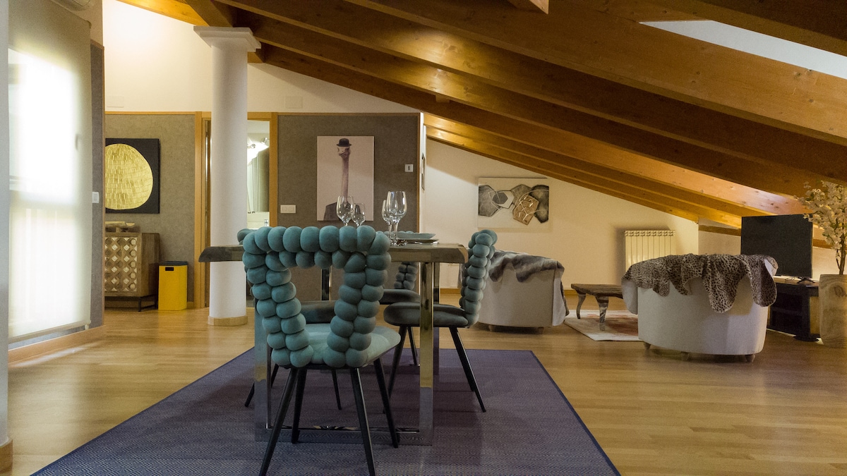 Prekrasan stan abuhardillado, obnovljen je s posebnim šarmom: iz prostranog dnevnog boravka - trpezarije pristupate namještenoj terasi kako biste uživali u nenadmašnom pogledu na stari grad (i tornjeve katedrale). Vrlo svijetlo. Idealno za par i vrlo udobno za 4 osobe. U legendarnoj zgradi, pored Calle Anche, palača Botines i Katedrala su nedaleko od vas, a nekoliko metara dalje nalazi se kvart Húmedo, tipičan za tapase. Autonomni broj: VUT-LE-195