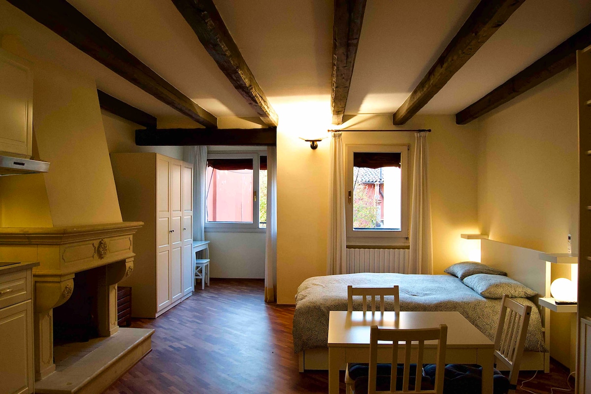 Elegantan i vrlo miran studio apartman koji se nalazi u tipičnoj zgradi u historijskom centru Bologne, potpuno renoviran i namješten 2020. godine. Stan se sastoji od prostranog i svijetlog studija s romantičnim kaminom od prirodnog kamina. Ima čajnu kuhinju s indukcijskom pločom za kuhanje i potpuno opremljenom. Kupatilo je opremljeno velikim tušem, a gostima je na raspolaganju mašina za pranje veša. Stan je u potpunosti klimatizovan, opremljen TV-om Smat (40 inča) i Wi-Fi mrežom.