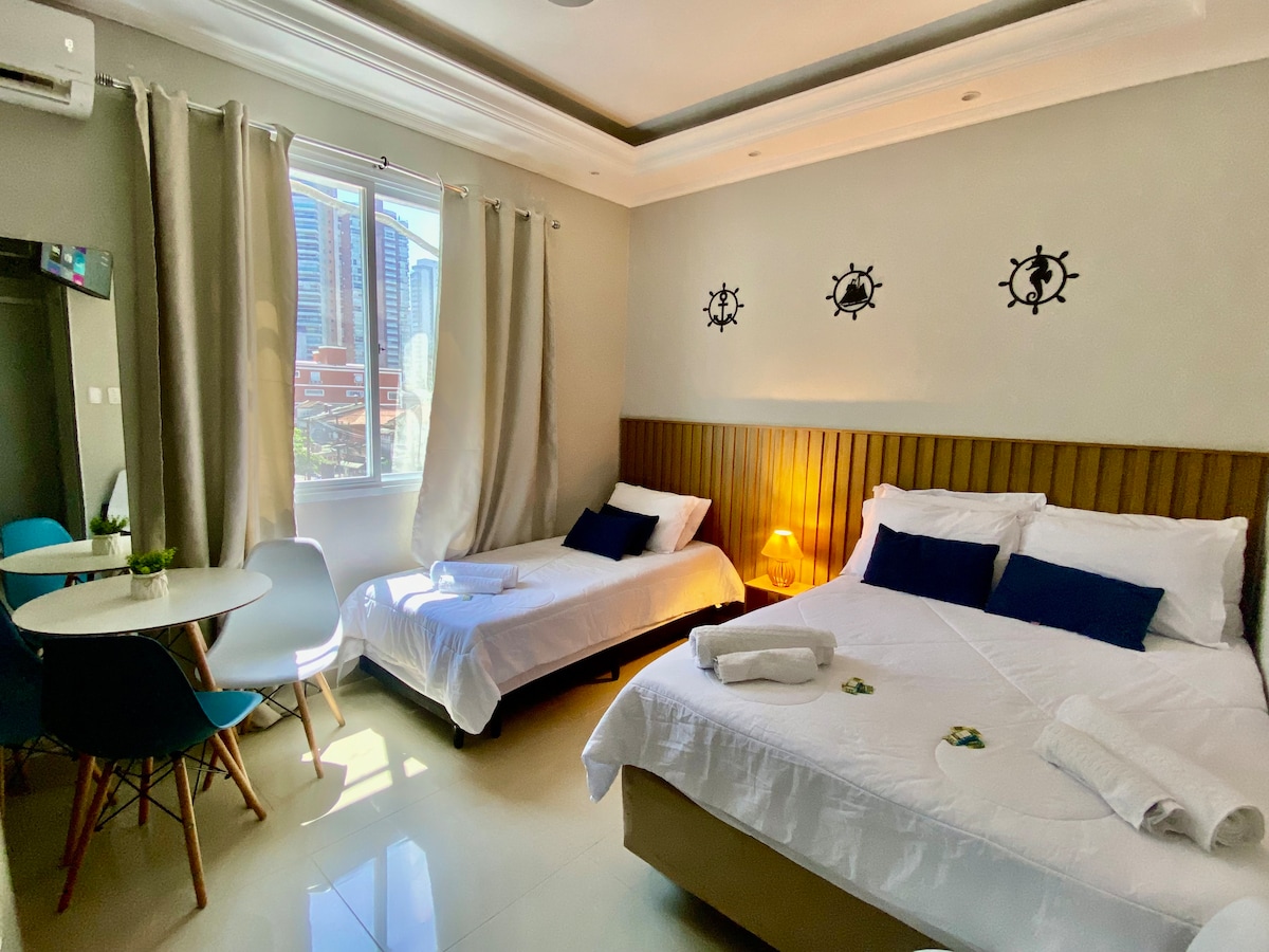 🏖️Smješten u Embaréu, okrenut prema plaži i između kanala 4 i 5, nudi bočne poglede na more i direktan pristup vrtovima na obali; samo pređite aveniju! 🛍️Područje je puno sadržaja: kiosci, barovi, restorani i trgovine. Supermarket Pão de Açúcar je pored zgrade, što osigurava praktičnost. 🛌Idealno za one koji traže odmor, može primiti do 3 osobe. Atmosfera je moderna i ima sve što vam je potrebno da uživate u boravku u glavnom gradu obale São Paula.
