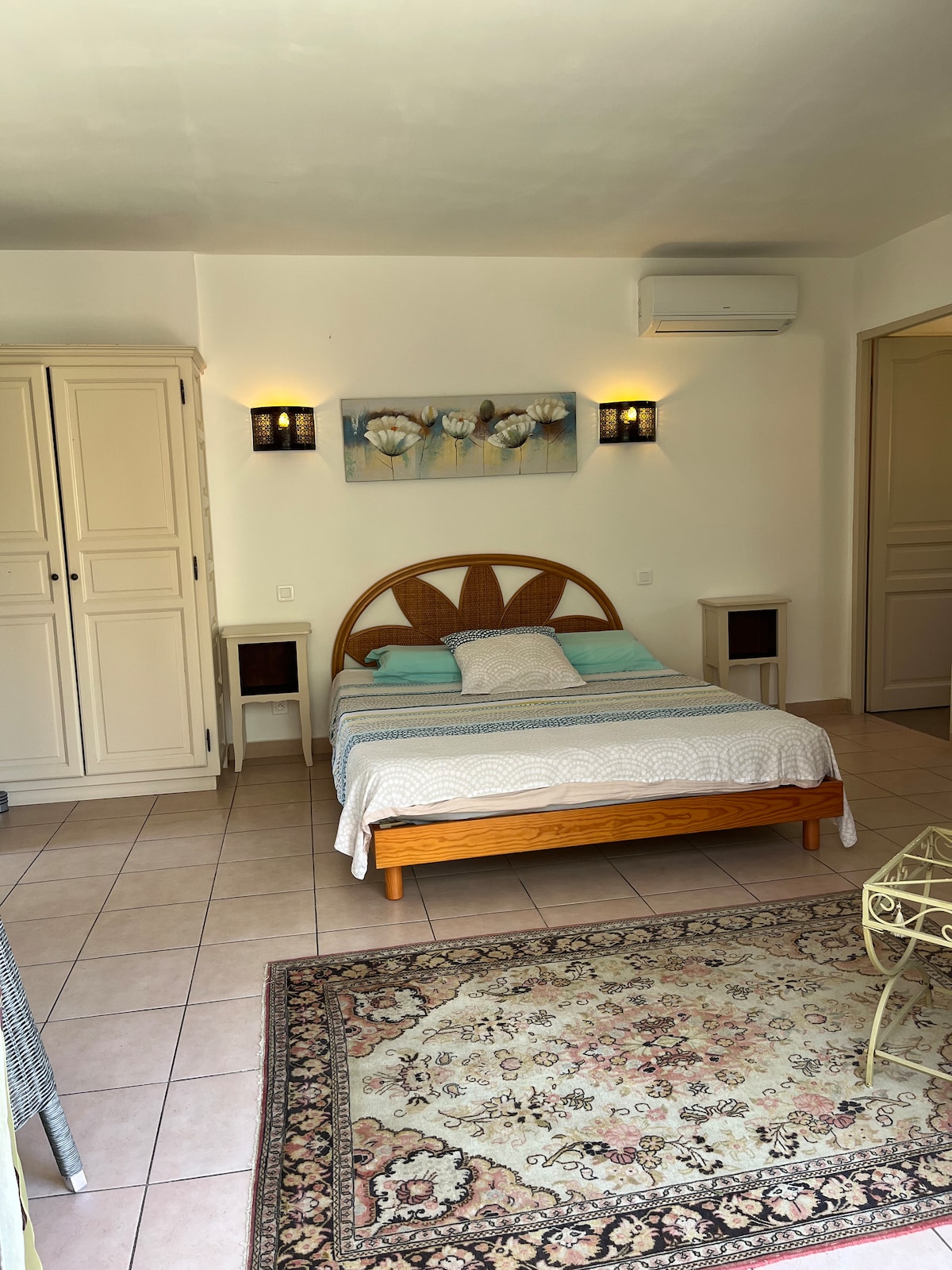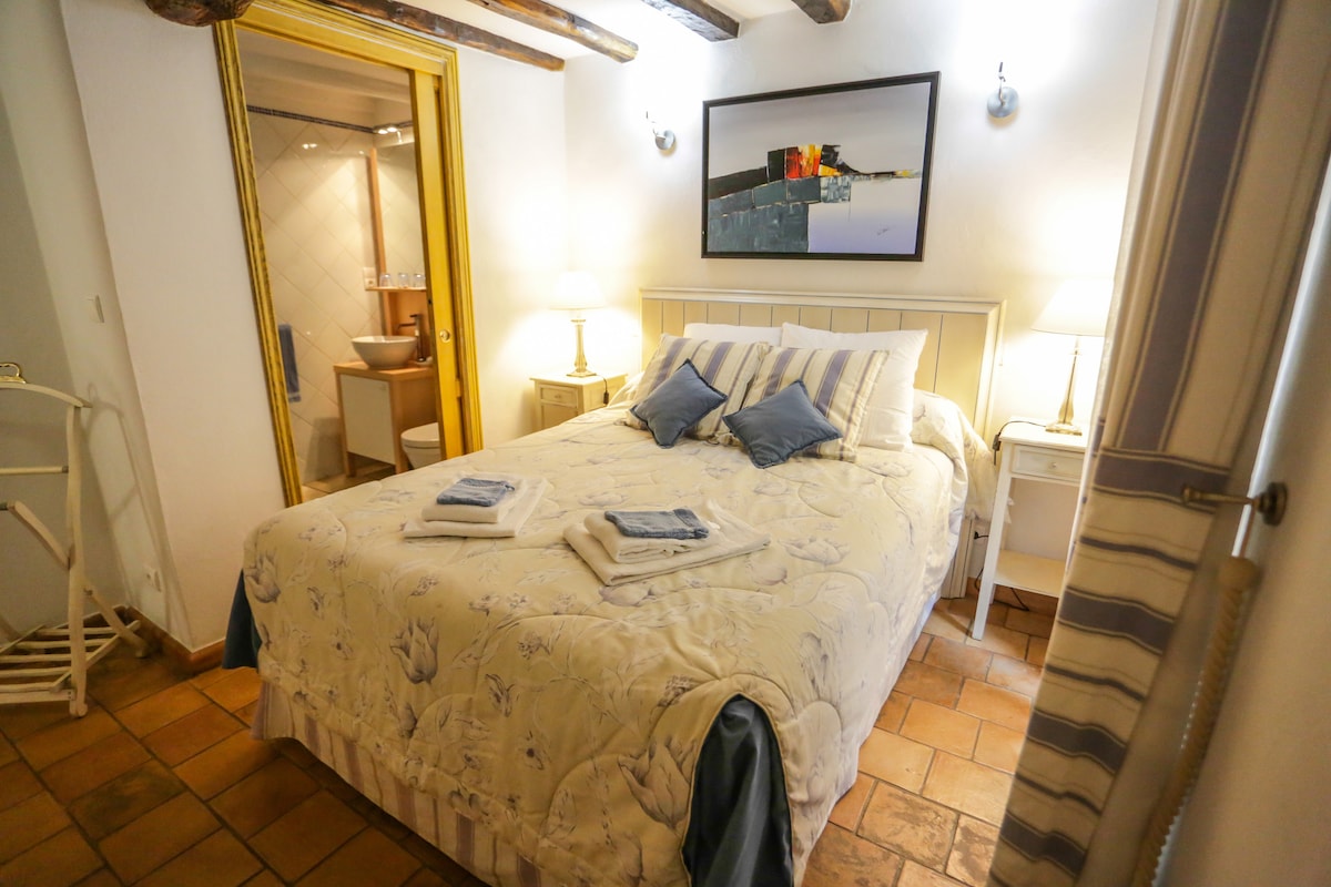 Dvokrevetna klimatizovana spavaća soba,sa privatnim kupatilom (tuš kabina i WC), čajnom kuhinjom, TV-om, nezavisnim ulazom na pod u vrtu, terasom, privatnim parkingom, na parceli površine 1600 m2 u hladu stoljetnih maslina. U blizini se nalaze restorani. Brigitte vam nudi stol za goste u nekim večernjim satima sedmično. Posuđe se poslužuje u spavaćoj sobi ili na terasi u skladu sa sanitarnim smjernicama.