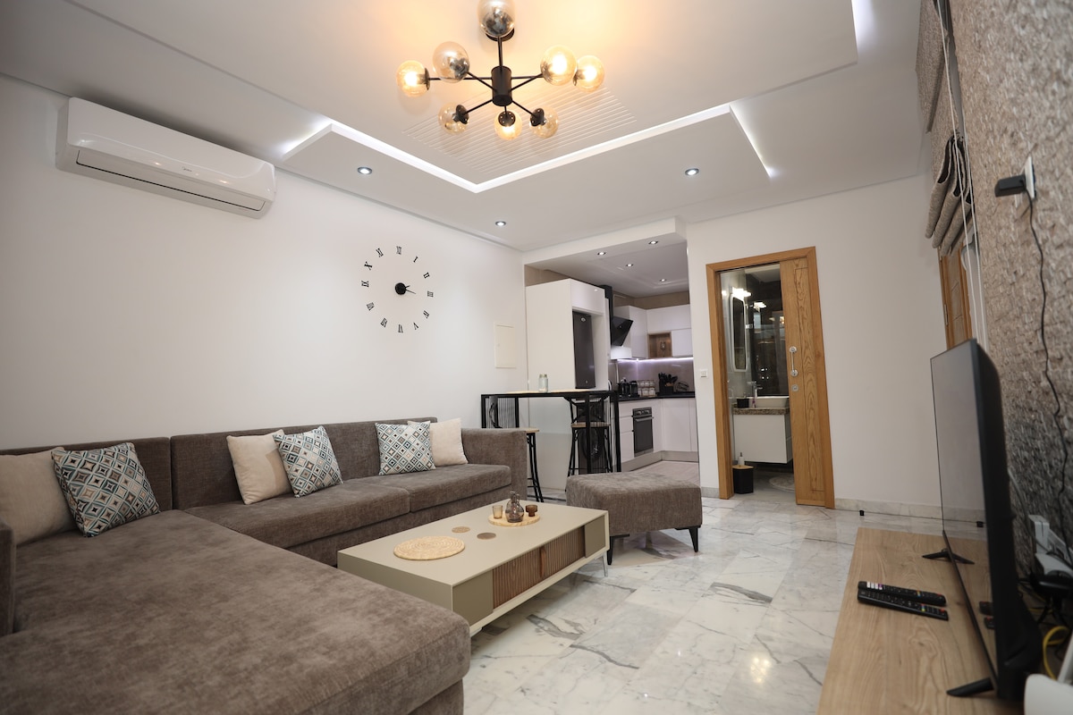 Šarmantan stan S+2 u hamamu Sousse, savršeno smješten na obalnom putu. Smještaj je moderan, čist i dobro opremljen kako bi se osigurao ugodan boravak. U blizini ćete naći sve potrebne usluge: supermarkete, kafiće, restorane, apoteku, vodeni park. Plaža je vrlo blizu, udaljena samo 3 minute vožnje i 9 minuta hoda. Idealno za uživanje u miru, suncu i moru tokom cijele godine.