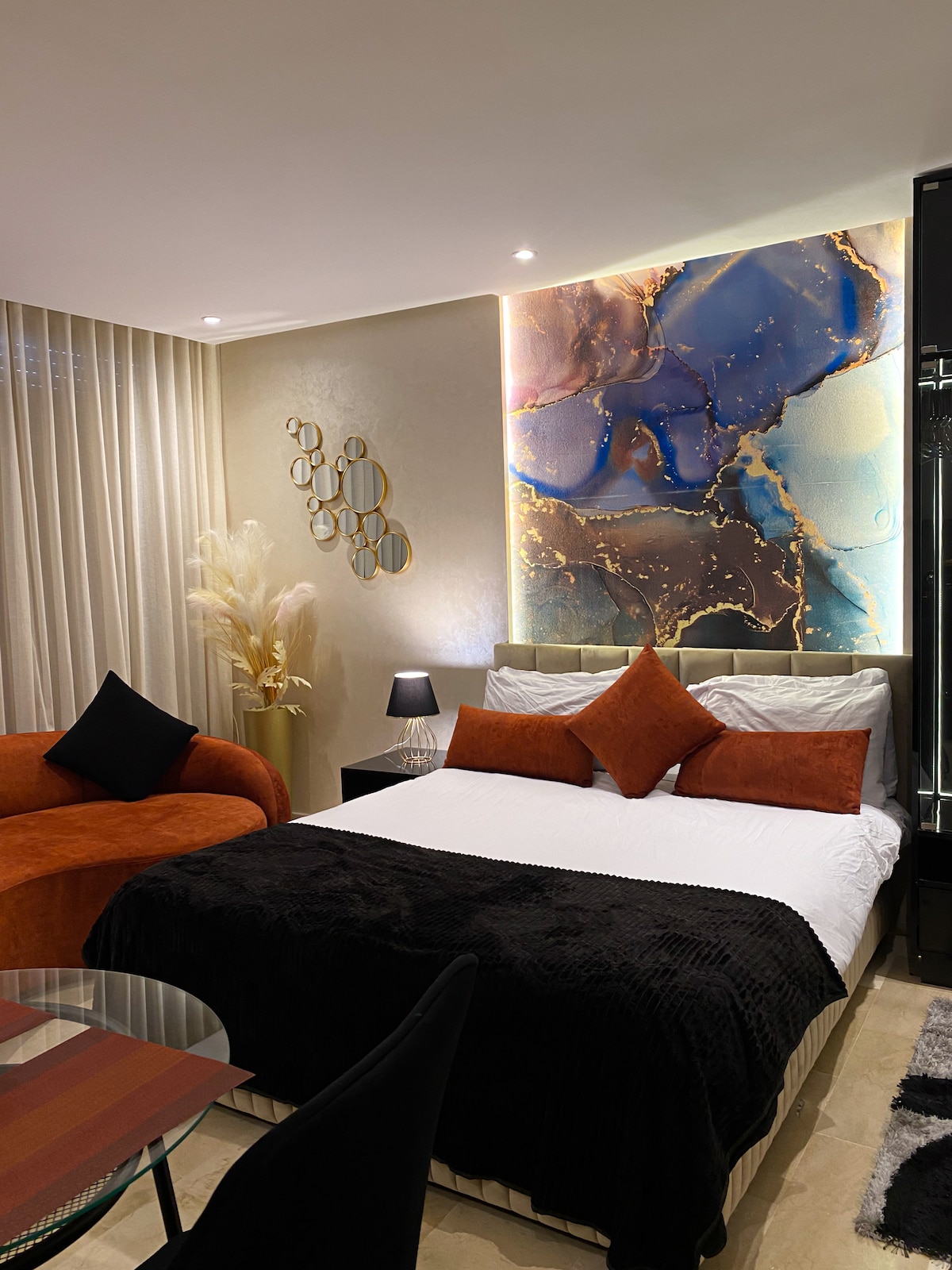 Smješten u popularnom području Burgundije Počastite se nezaboravnim✨ odmorom! u ovom novom luksuznom apartmanu vrijednom 💫hotela Franke s 5 zvjezdica. Mirna sigurna lokacija s unutrašnjim parkingom Bračni krevet (širine 180-220 cm), klimatizovan. Moderno kupatilo Wi-Fi Smart TV Netflix i iptv Nalazi se pored ulice TanTan i nudi jednostavan pristup svim sadržajima. Butici Restorani Kafić koji animira ovu arteriju , u blizini poznate džamije Corniche i Hassan II.