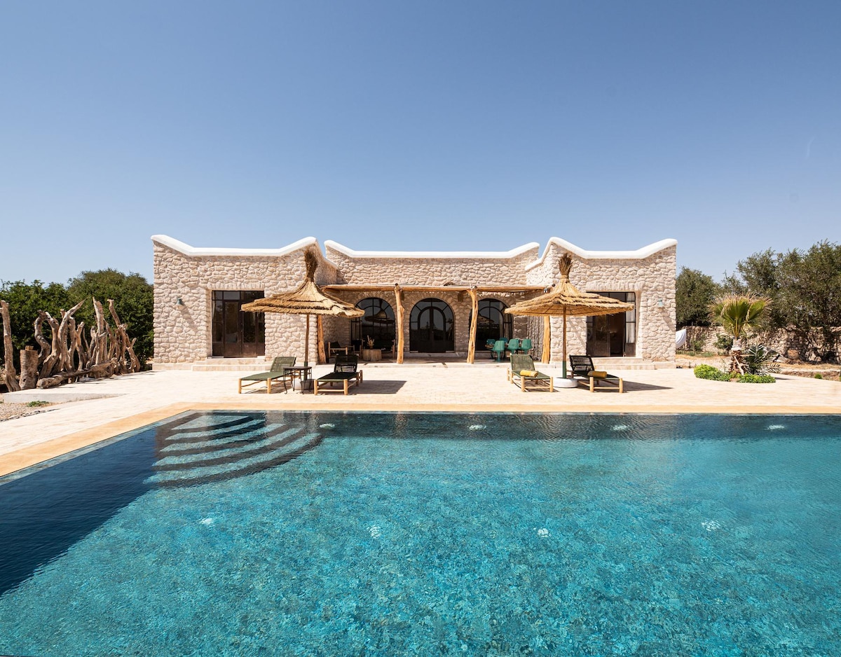 Charming Family Villa, 2levels, independent, spacious, well illuminated, a big private pool of 75m² and a beautiful garden. Located on the countryside, 16km from Essaouira on Sidi Kaouki rd, it has a luxurious finish, chimney, open fire place in the garden, olive and fruit trees and two beautiful Terraces with pergolas. Modern and peaceful. Airport at 6.5km and shops and a supermarket at 10min. You will need a vehicle to get around.