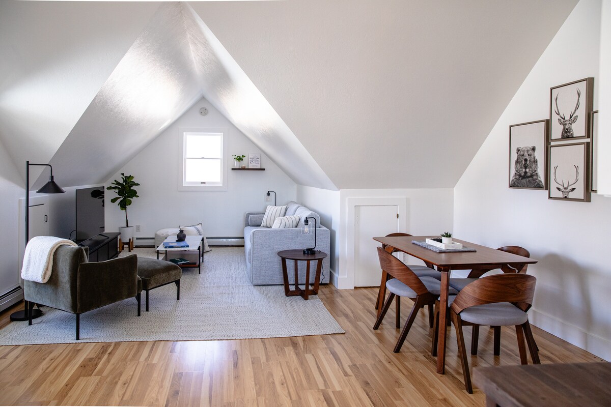 600ft² above garage suite in a residential neighborhood • Free, on-street parking for up to two vehicles • Continental breakfast • No contact self check-in/out • Fully stocked + equipped kitchen • Close to walking paths, parks, and dog-friendly areas. Newly renovated modern retreat just minutes from downtown Bozeman. Relax in a bright, open and inviting Scandinavian-style space featuring a king bed. 》3 miles MSU 》3 miles Downtown 》28 miles Big Sky 》82 miles Yellowstone National Park