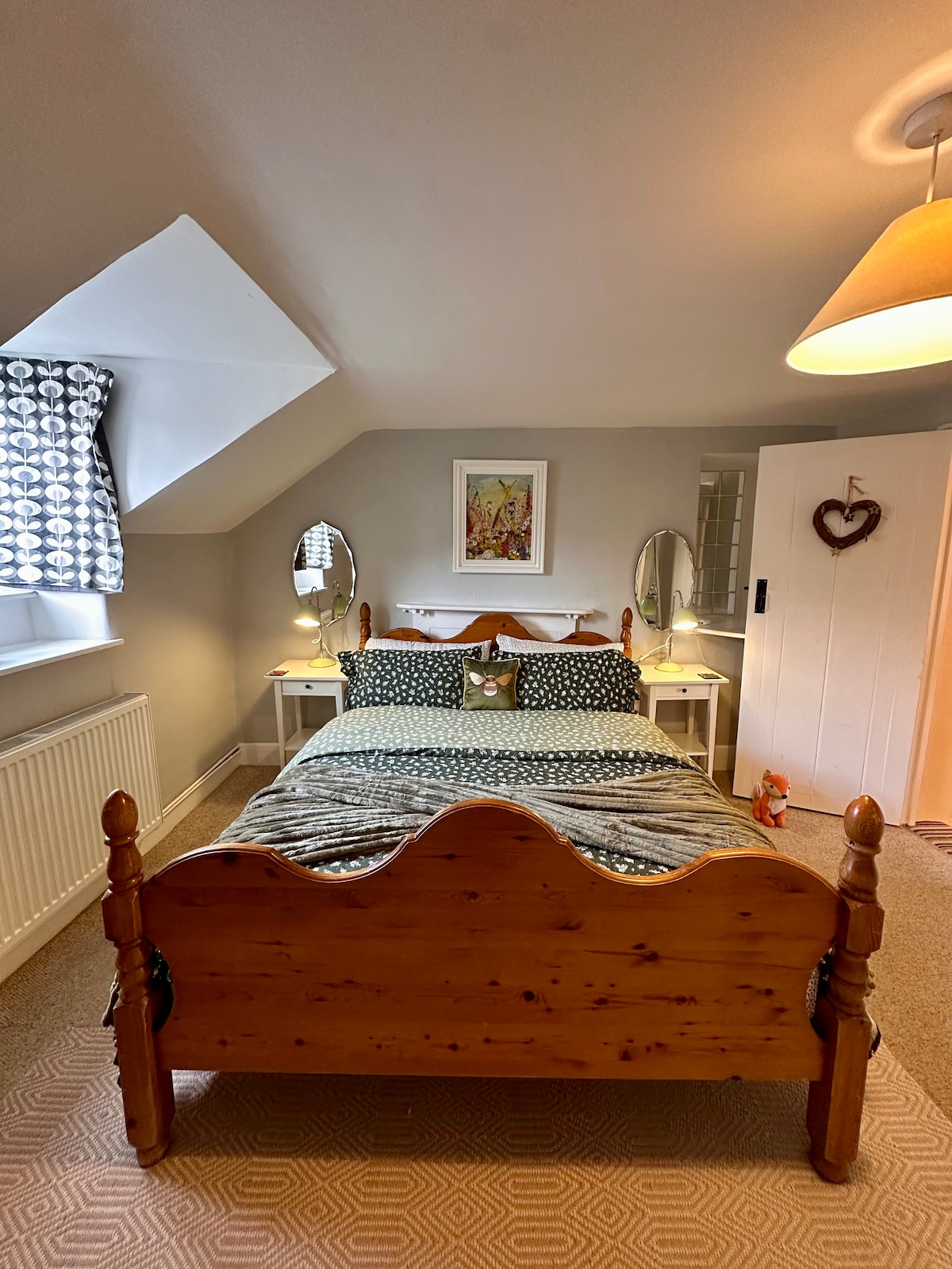 This light and airy space packs a lot of character with exposed oak beams and a wooden oak floor, a glass apex window lights the room and allows you to star gaze from your bed at night. An antique french bed gives a romantic feel to the room with crisp bed linen, there is a bathroom and a luxurious double ended antique roll top bath.Guests have sole use of 'The Loft'- with a kitchen and dining area and can also book a private sauna experience and/or a private log fired hot tub session .