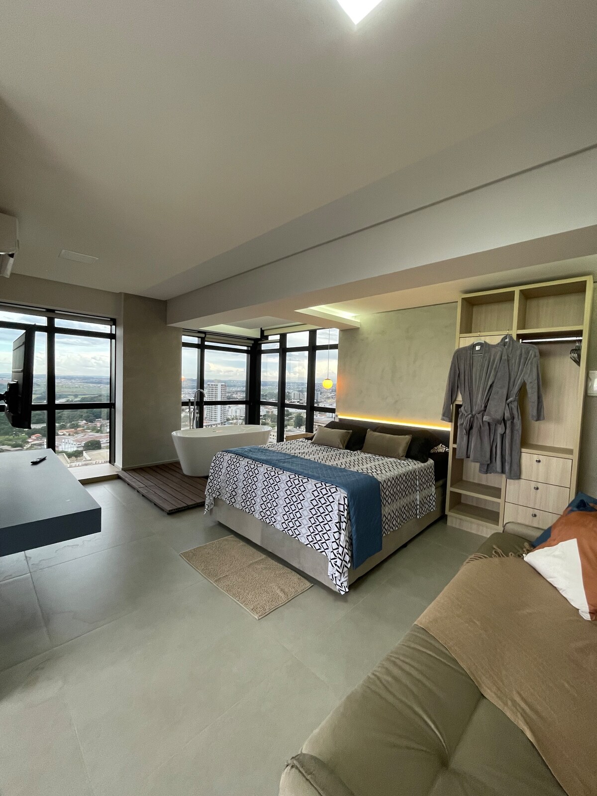 Naš apartman vam nudi pametni TV, Wi-Fi, klima-uređaj, električni aparat za kafu, frižider, aparat za sendviče, šporet, osnovni kuhinjski pribor i dva kreveta za jednu osobu s NASA jastucima. D33 madrac. Condomínio ima rotirajući parking, lift, stalak za bicikle i odličan zajednički prostor s: roštiljem, bilijarskim stolom, klupom za coworking i vešom sa sušilicom. Nema navlake za raskrsnicu kreveta.