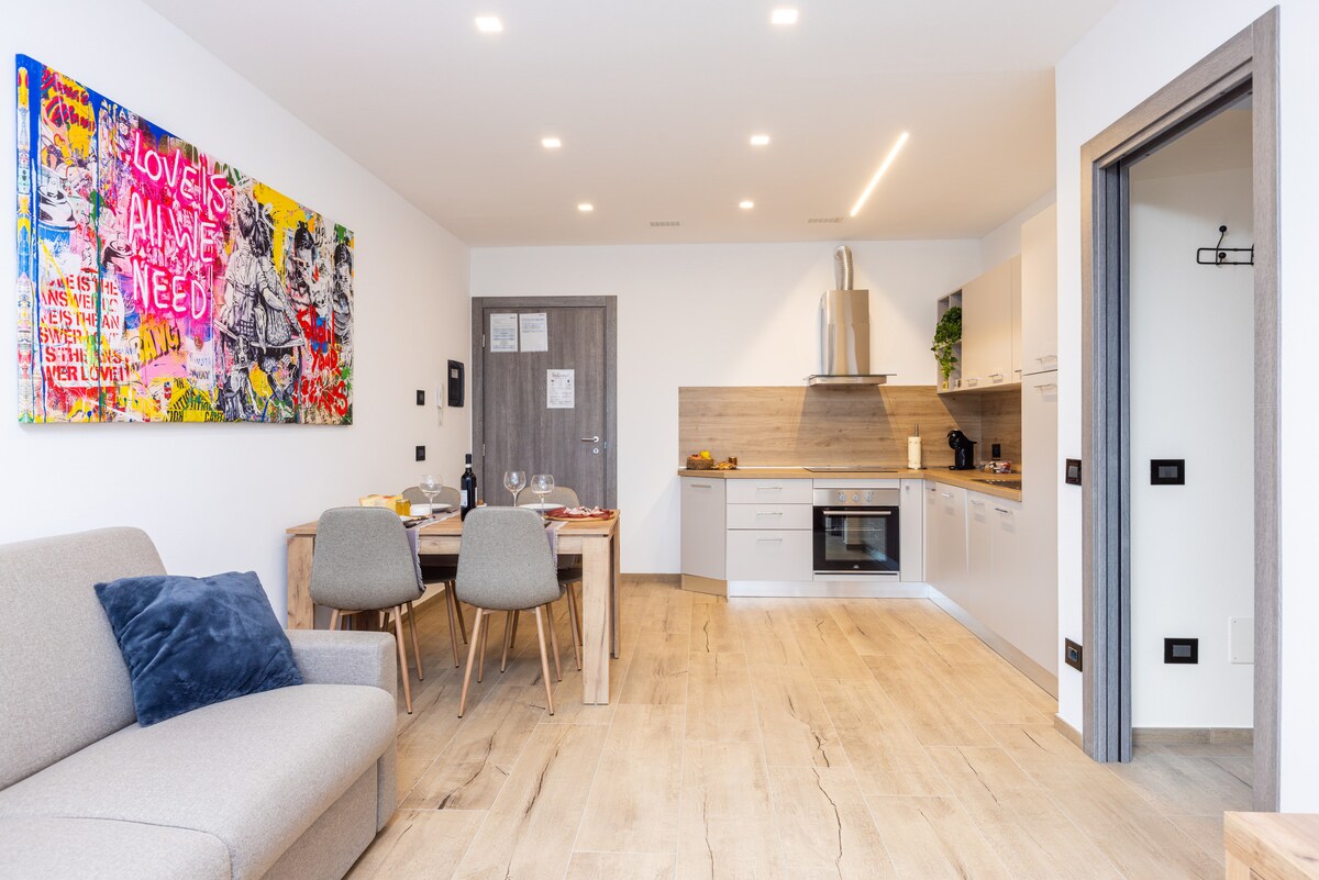 Ampio e luminoso appartamento, arredato in stile moderno, situato al primo piano di una casa indipendente contornata dal verde e con vista sulle Alpi Orobie e Retiche. Dispone di: Spazioso open space con cucina attrezzata e zona living dal quale si accede a due terrazzi. Il terrazzo coperto è attrezzato con tavolo e sedie. Luminosa camera matrimoniale con cabina armadio integrata e ulteriori due camere ciascuna con due letti singoli. Un bagno con vasca idromassaggio e un altro con doccia.