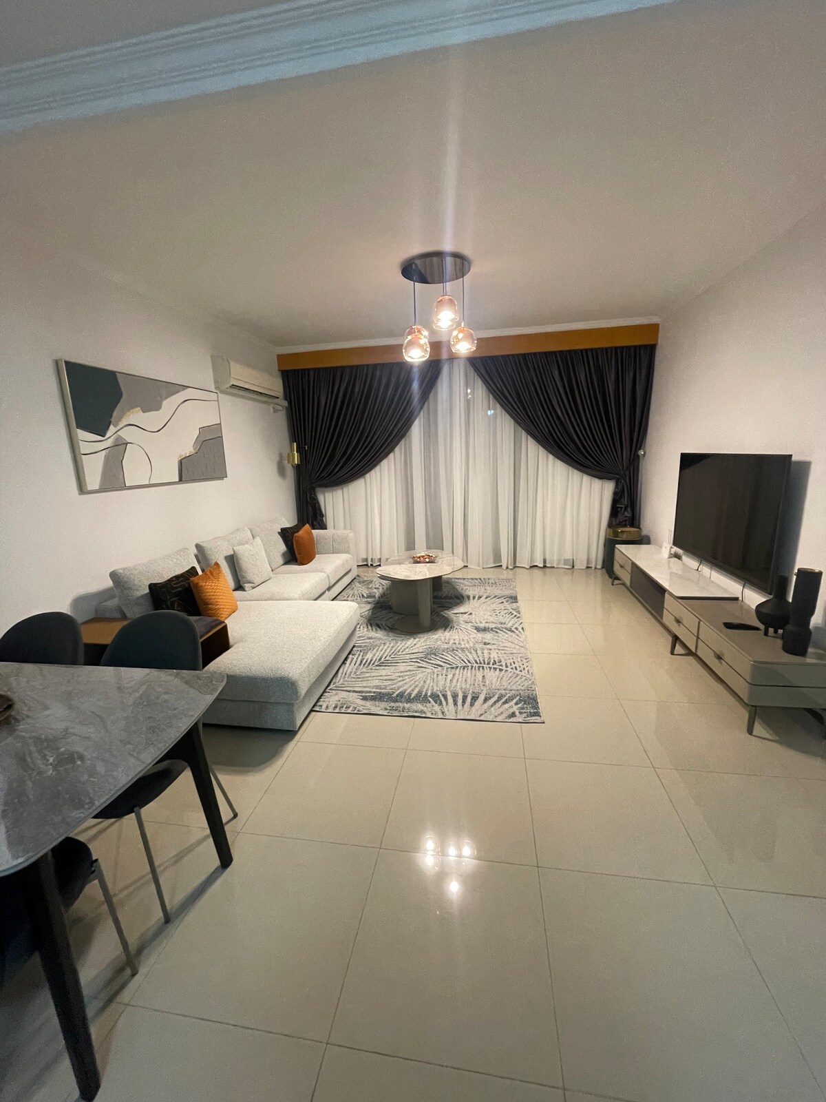 • Zapanjujući stan u potpunosti namješten, unutar dvije spavaće sobe, dnevnog boravka, čajne kuhinje, kupatila i modernih toaleta. • Ima veliki QLED ekran od 55inča s Netflixom i Wi-Fi vezom. • Dnevni i noćni čuvar, usluga čišćenja 0-24, osigurana alarmnim sistemom i električnom ogradom, kao i CCTV kamerama. • Elektronski generator u slučaju nestanka struje, serije vode i privatnog parkinga.