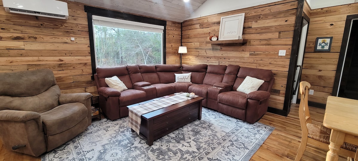 Sa velikom privatnom terasom s vanjskim ognjištem, roštiljem na drveni ugalj, vanjskim stolom za sjedenje i trpezarijskim stolom i masažnom kadom za 6 osoba, brvnara Hullaballoo Hideaway savršena je za vikend odmor, posebno ako volite boravak na otvorenom! Unutra ćete pronaći potpuno opremljenu kuhinju, stol za trpezariju za 6 osoba, glavnu spavaću sobu s bračnim krevetom i potkrovlje na katu s dvije kraljice. Kauč u dnevnoj sobi dodaje dodatni prostor i ima 3 puna naslonjača. Imamo i zračni madrac ako je potrebno.