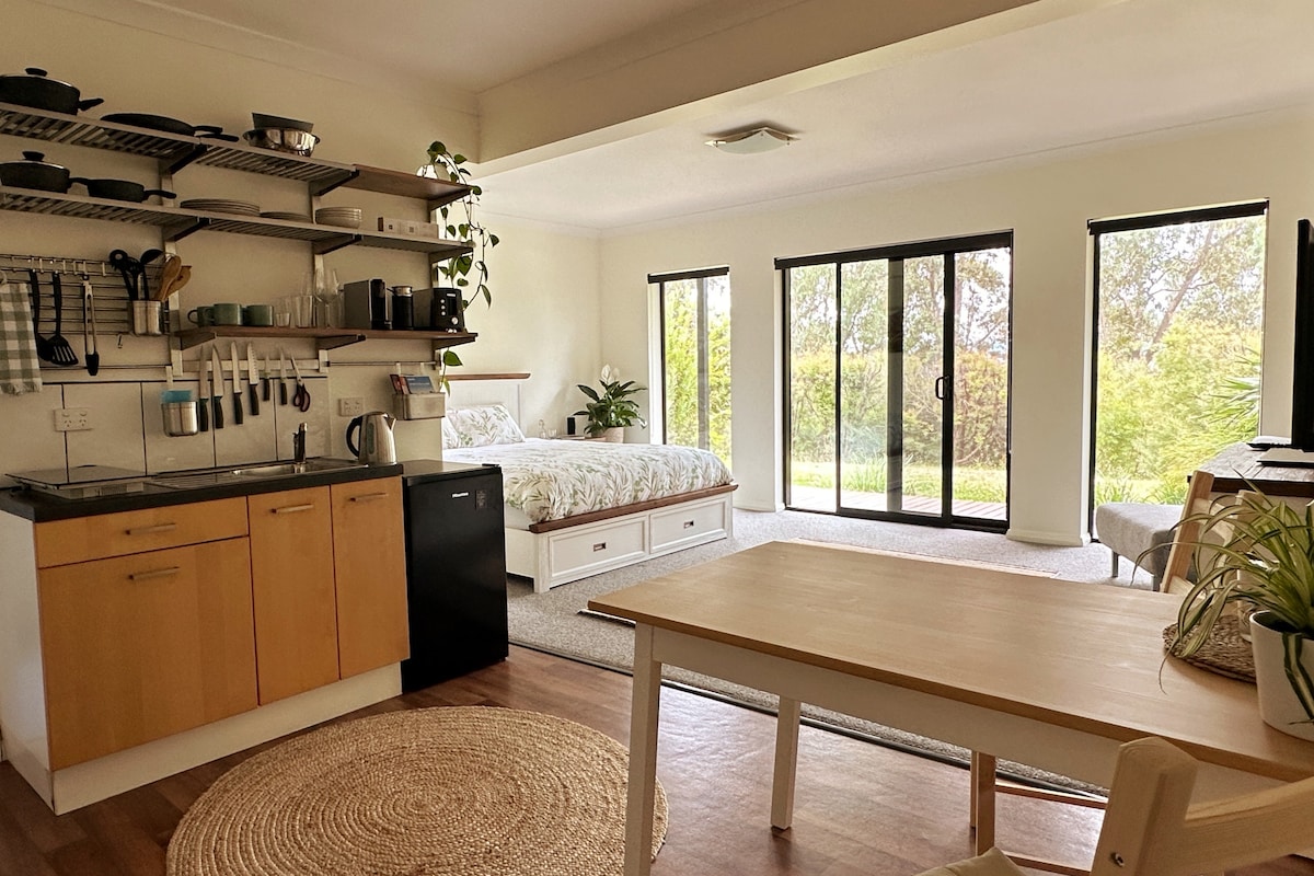 Gorgeous fully self-contained unit, nestled in a peaceful garden setting with town just a ten minute stroll away. Take in the views from the cosy lounge area. In the bedroom there is a queen size bed with fluffy pillows and doona. Luxury bath towels and toiletries await you in the bathroom and the kitchenette is fitted with a microwave, mini fridge, toaster, and is complemented by a Nespresso coffee machine. There is a covered deck area with seating to enjoy the view of surrounding mountains.