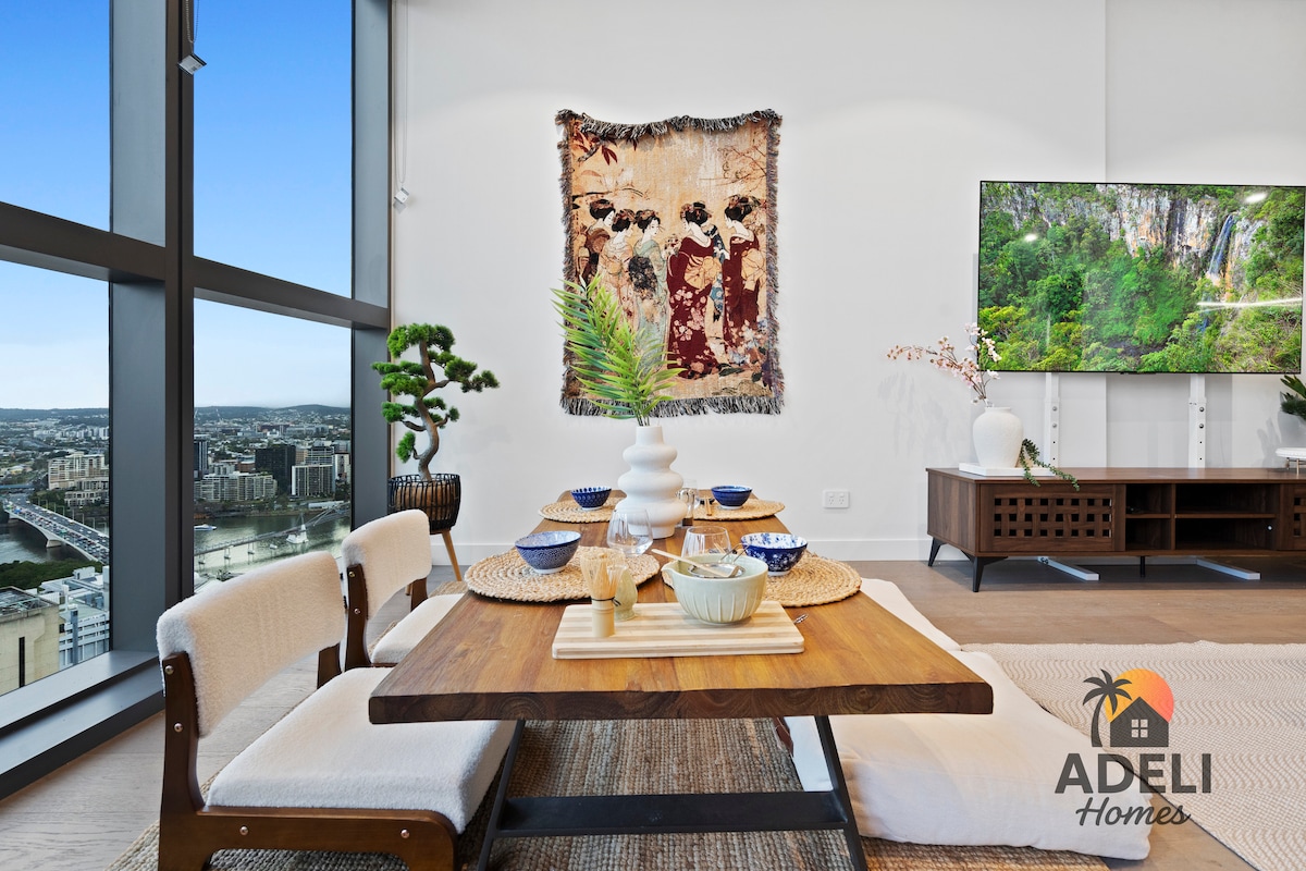 Soar above the city and unwind in serene, sky-high luxury at the New Queen’s Wharf. Perched on the 59th floor, this beautifully brand new curated apartment combines calming nature-inspired interiors with jaw-dropping, uninterrupted views of Brisbane’s skyline, river, and mountains. Step into a tranquil space where soft earthy tones, natural textures, and luxe finishes create the perfect retreat—whether you’re here for business, a romantic escape, or a peaceful getaway in the heart of the city.
