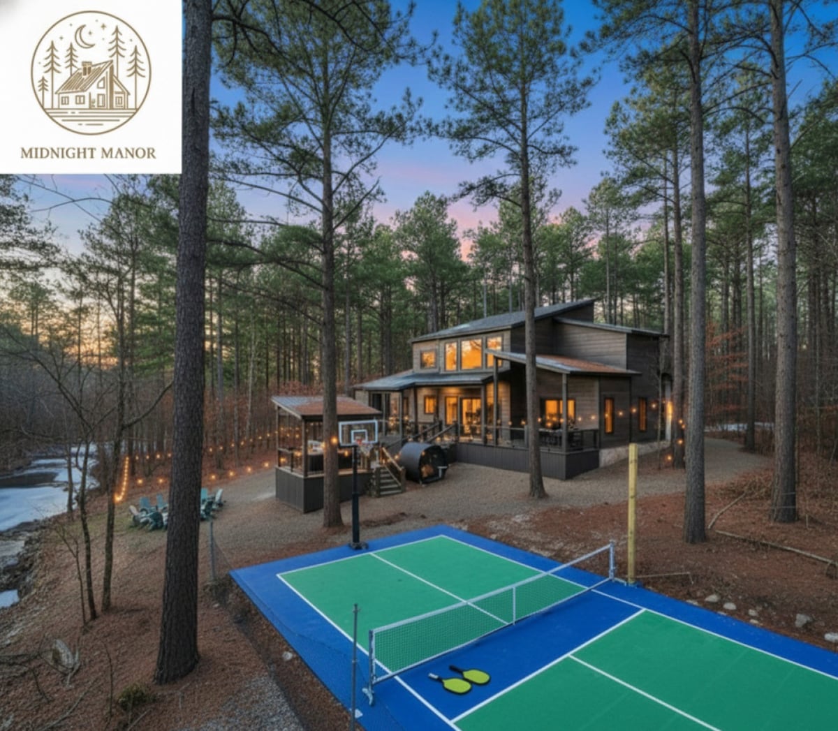 Smješteno među borovima, ovo luksuzno šumsko skrovište za 17 osoba ima privatnu filmsku sobu s ekranom od 86inča, masažnu kadu, omotane palube, ognjište, igraonicu, shuffleboard i još mnogo toga. Prikladno za pse (maksimalno 2, 150 $ po psu). 🎬 Filmska soba | 🛁 Masažna kada | 🔥 Ognjište | 🎮 Igraonica Set 🧒 za igru | Prikladno za 🐾 pse | 📡 Hulu + Disney+ ✭ „Pozorišna soba, set za igru i omotani trijem bili su upravo ono što nam je trebalo da se opustimo!”