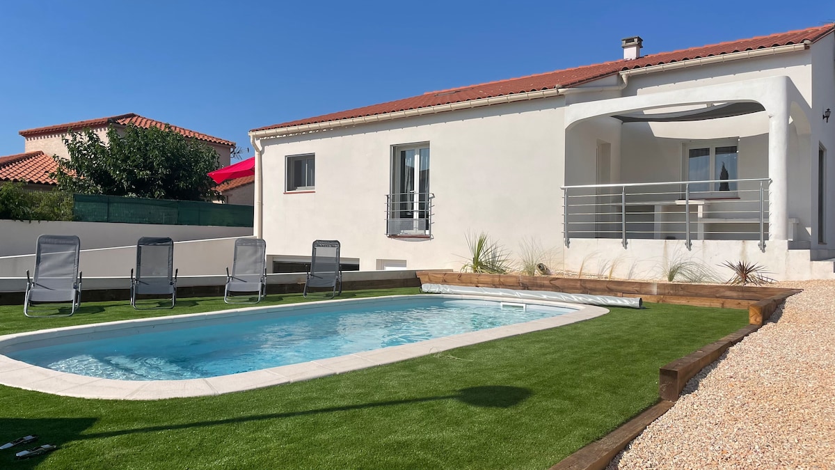 Nova i dobro opremljena vila s 4★ i 100 m² u Saint-Andréu, mirnom selu južno od Perpignana, između mora i masiva Albera. Idealno smješten za otkrivanje našeg regiona, 10 min od plaža, 15 min od Collioura i 30 min od Španije. Kapacitet 6 osoba, 3 udobne spavaće sobe, kupatilo i tuš kabina, klima uređaj, brzi Wi-Fi, privatni parking. Terasa opremljena za obroke i opuštanje i siguran privatni bazen. Trgovine i aktivnosti u blizini, mirno stambeno područje.