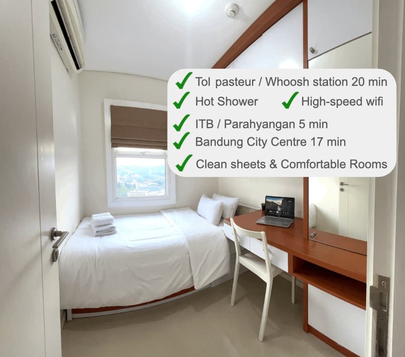 Naša lokacija se nalazi u centru grada, odmah pored 2 velika tržna centra i samo 800m od legendarne ulice Braga Na 18. spratu naša jedinica pruža osjećaj ekskluzivnosti, omogućavajući gostima da uživaju u miru i prekrasnim gradskim pejzažima. Potpuno opremljena kuhinja osigurava praktičnost, Ova jedinica kombinuje sofisticiranost i praktičnost za nezaboravan boravak u srcu Bandunga. Imajte na umu da je parking, i za motocikle i za automobile, bezgotovinski 🙏☺️