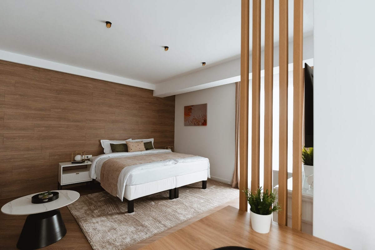 Otkrijte našu najveću i najiznenađujuću sobu – elegantan apartman u novoizgrađenom boutique hotelu. Spiralno stepenište povezuje udobnu spavaću sobu s bračnim krevetom (širine 180–220 cm) na spratu sa svijetlim dnevnim boravkom u prizemlju. Bijele drvene grede i prirodni tonovi stvaraju opuštajuću atmosferu grčke vile, spajajući šumske i priobalne elemente. Nalazi se u Starom gradu u Bukureštu, a dio je odabrane kolekcije butik smještaja. Savršeno za parove ili duže boravke, nudi udobnost, privatnost i jedinstven doživljaj uređenja.