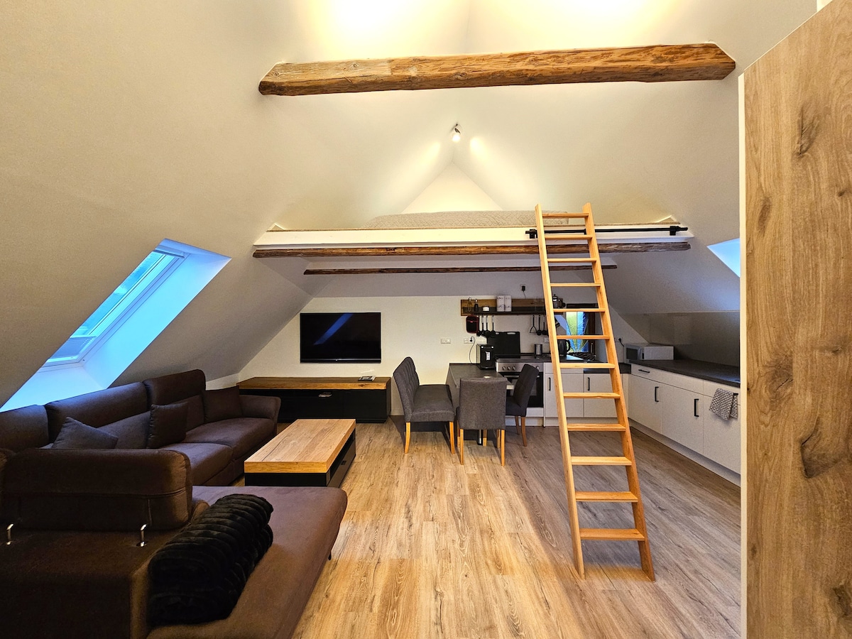 Novoizgrađeni podrumski stan u blizini željezničke stanice i dvorca. Potpuno opremljena kuhinja sa šporetom, frižiderom sa zamrzivačem, mašinom za suđe, aparatom za kafu i tosterom pruža vam svu slobodu koja vam je potrebna za kulinarske večeri u trpezariji ili na velikoj terasi s plinskim roštiljem. Novi kauč na razvlačenje je opremljen punim madracem. SmartTV s Prime, Disney, rtl+ i Alexa prate opuštanje. U kupatilu se nalaze tuš kabina, pisoar i mašina za pranje i sušenje veša.