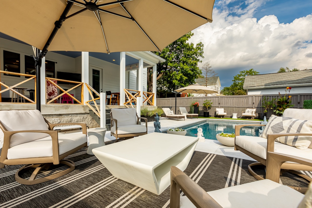 Ekspanzivan i zapanjujući jedinstveni smještaj u srcu četvrti nacije u Nashvilleu. Nećete pronaći drugu kuću poput ove! Samo 10 minuta do Broadway područja u centru Nashvillea. Privatni bazen + masažna kada. Ograđeno dvorište, vanjski namještaj za terasu, prozori od poda do plafona, veliki vanjski i terasni prostori, roštilj, kamin, kuhinja za kuhara i elegantne završne obrade. Ovaj moderni ranč ima sve! Prošetajte do restorana, pivara, kupovine i kafe. Bazen se može grijati uz naknadu.